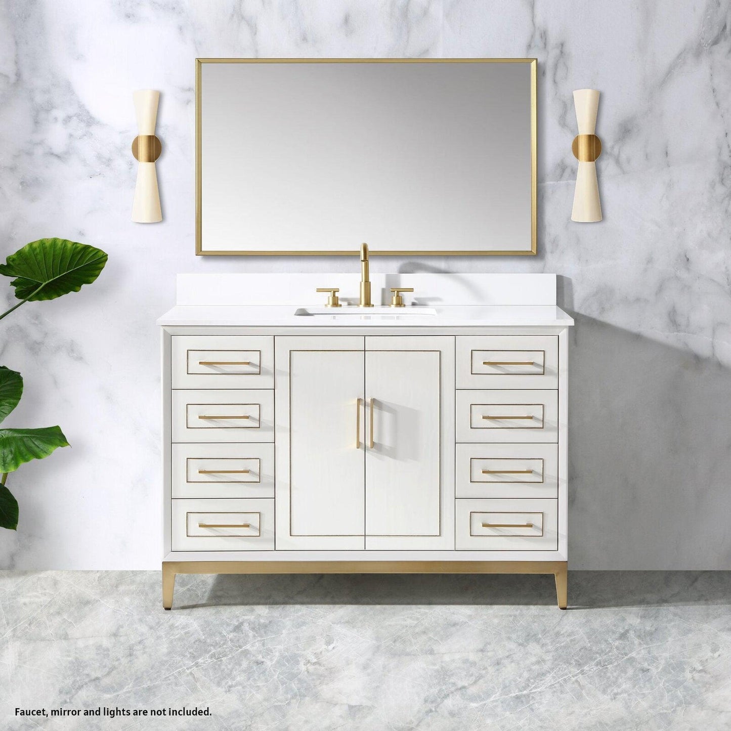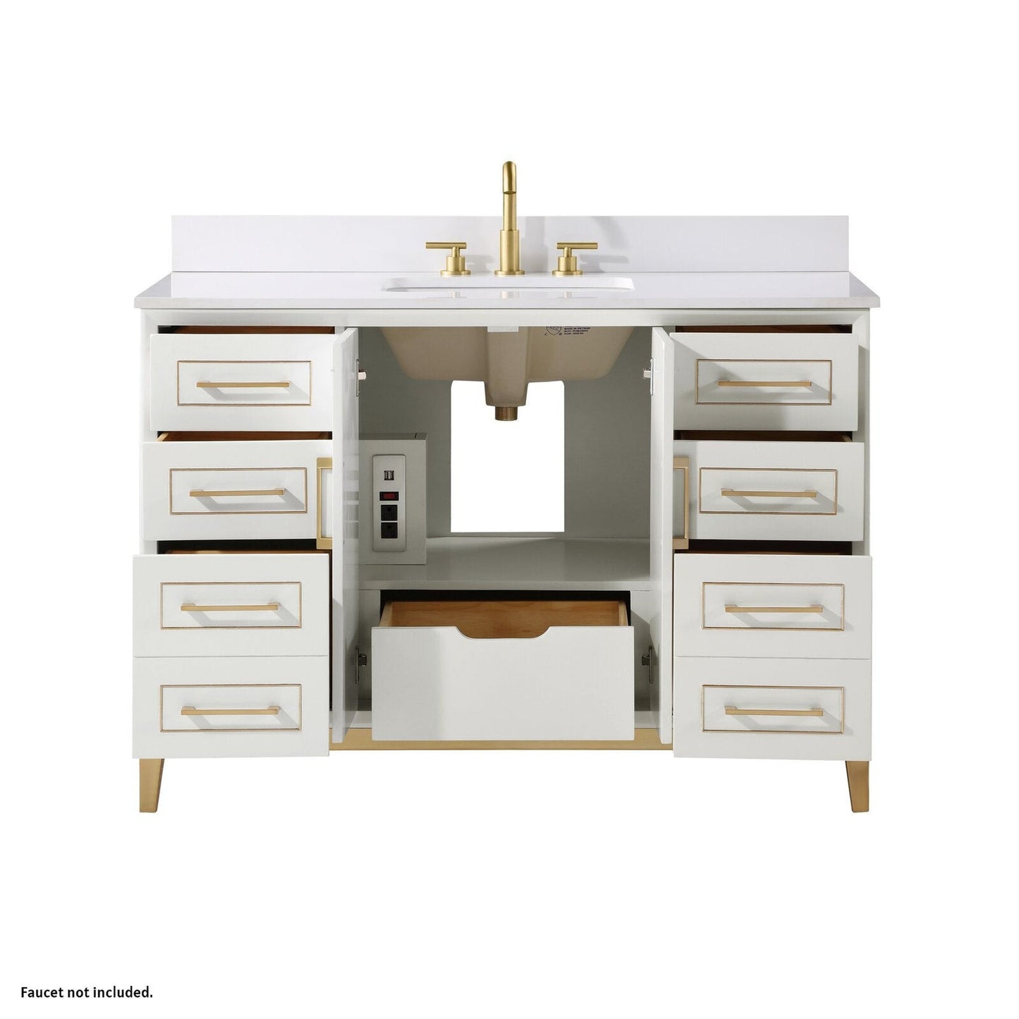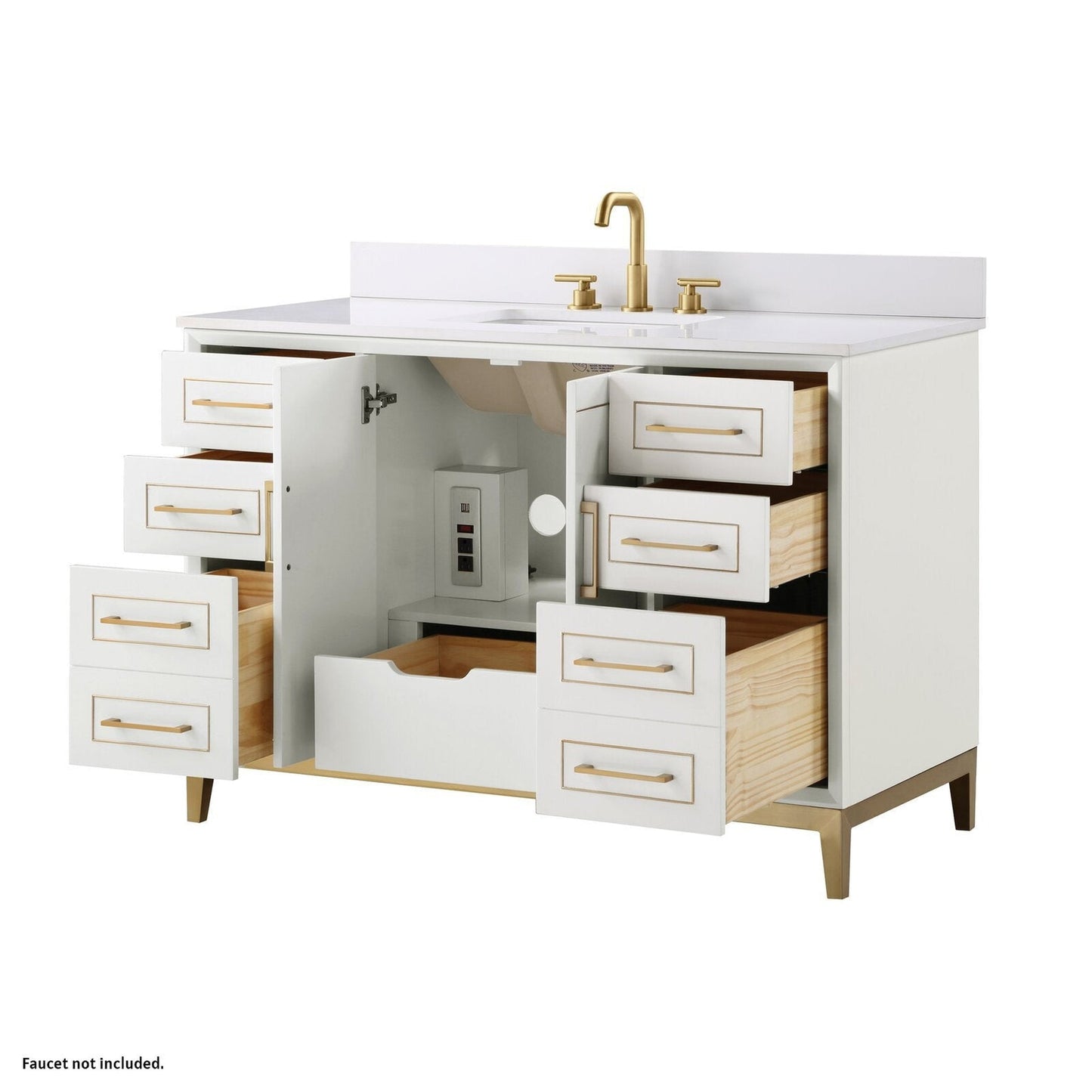 Bemma Design Gracie 48" Satin White Solid Wood Freestanding Bathroom Vanity With Single 3-Hole White Quartz Vanity Top, Rectangle Undermount Sink, Backsplash and Satin Brass Trim