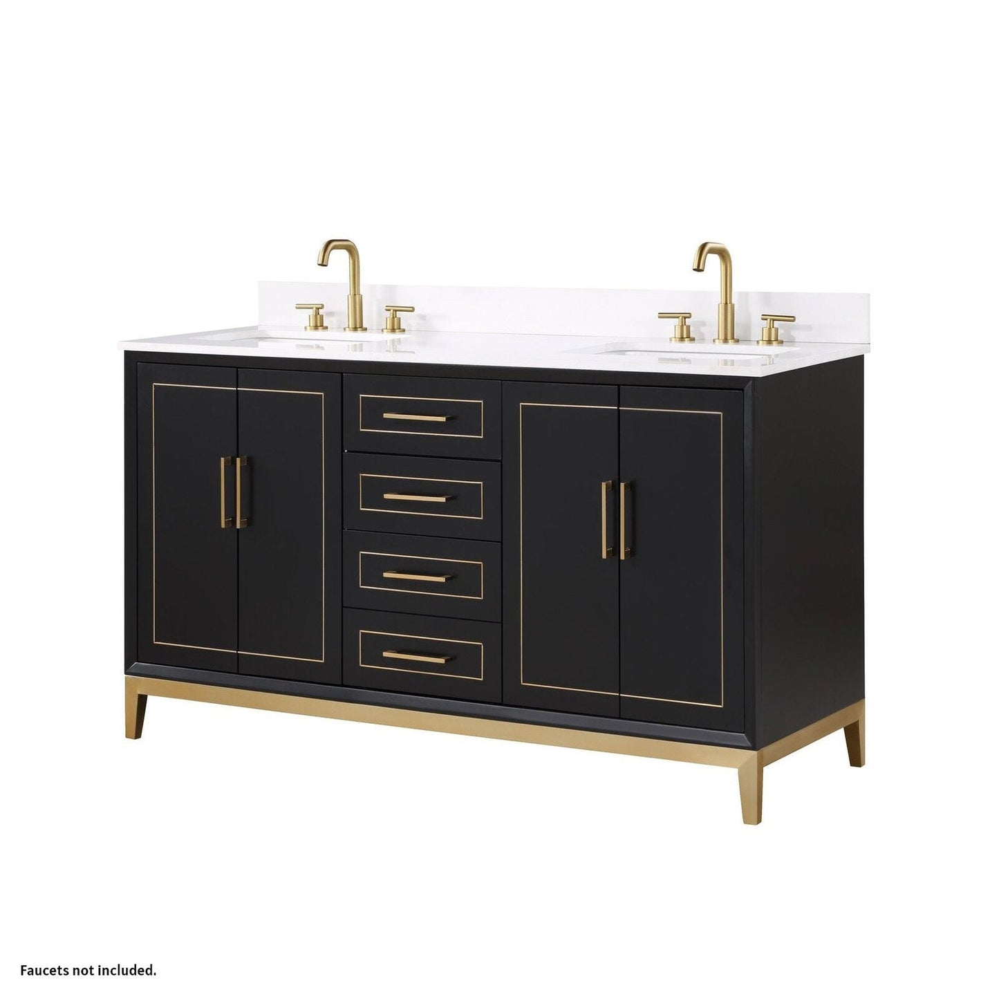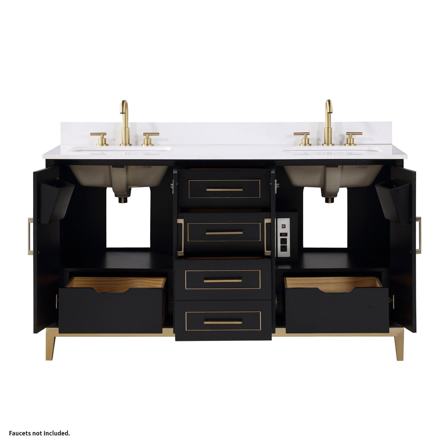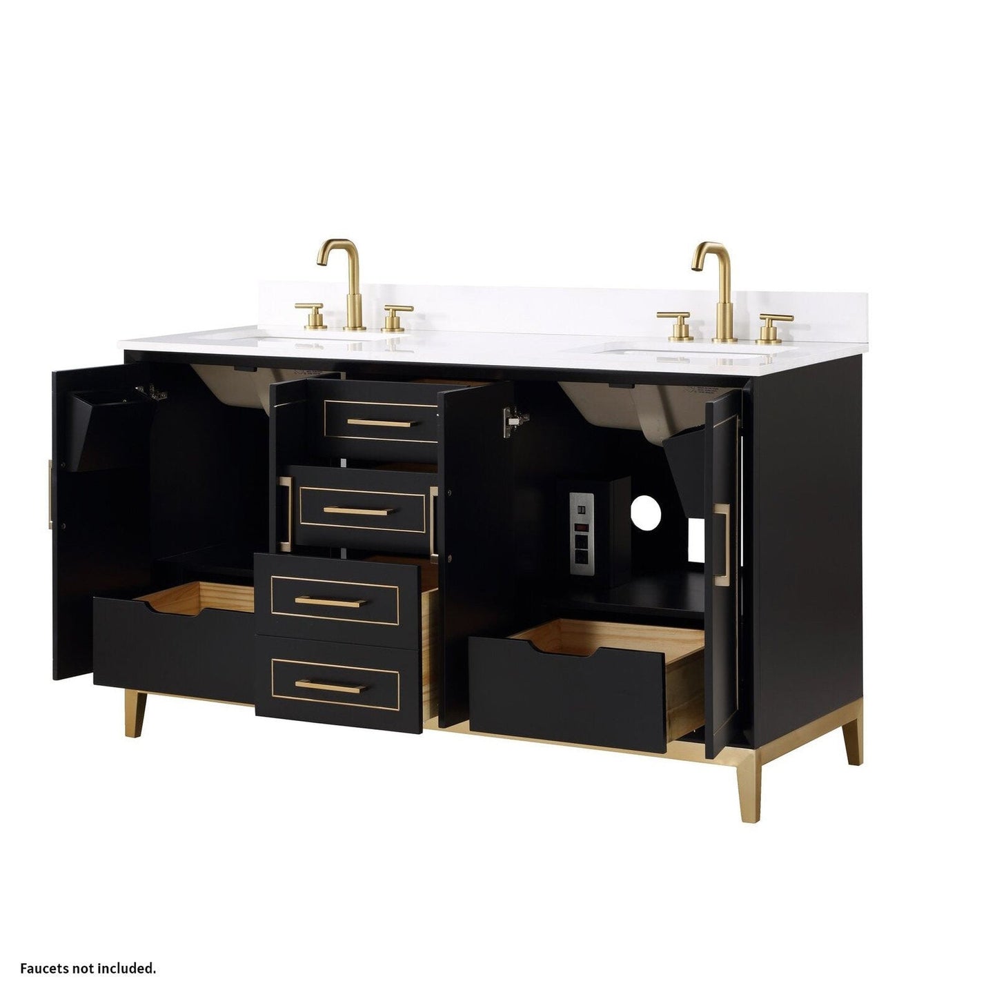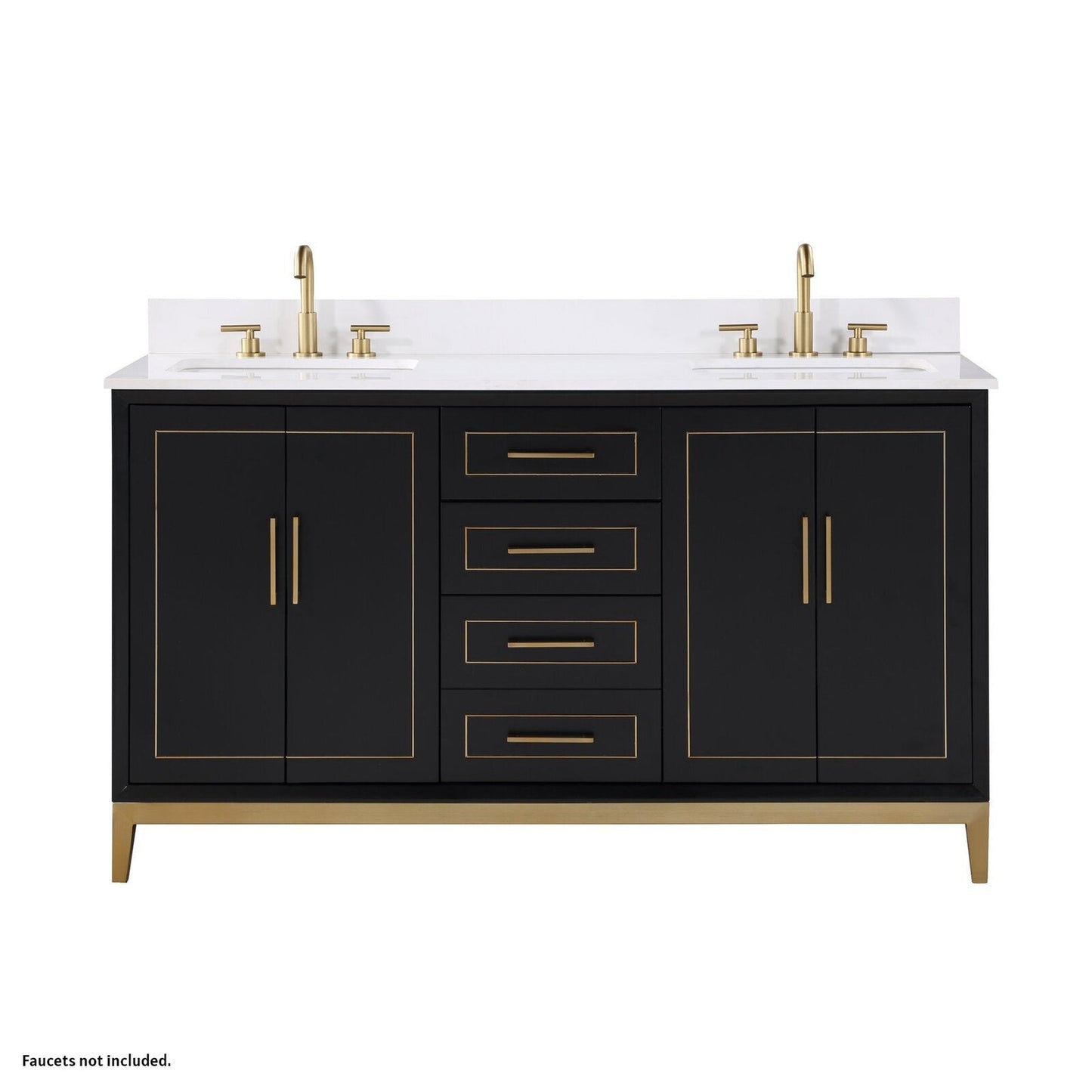 Bemma Design Gracie 60" Midnight Black Solid Wood Freestanding Bathroom Vanity With Double 3-Hole White Quartz Vanity Top, Rectangle Undermount Sink, Backsplash and Satin Brass Trim