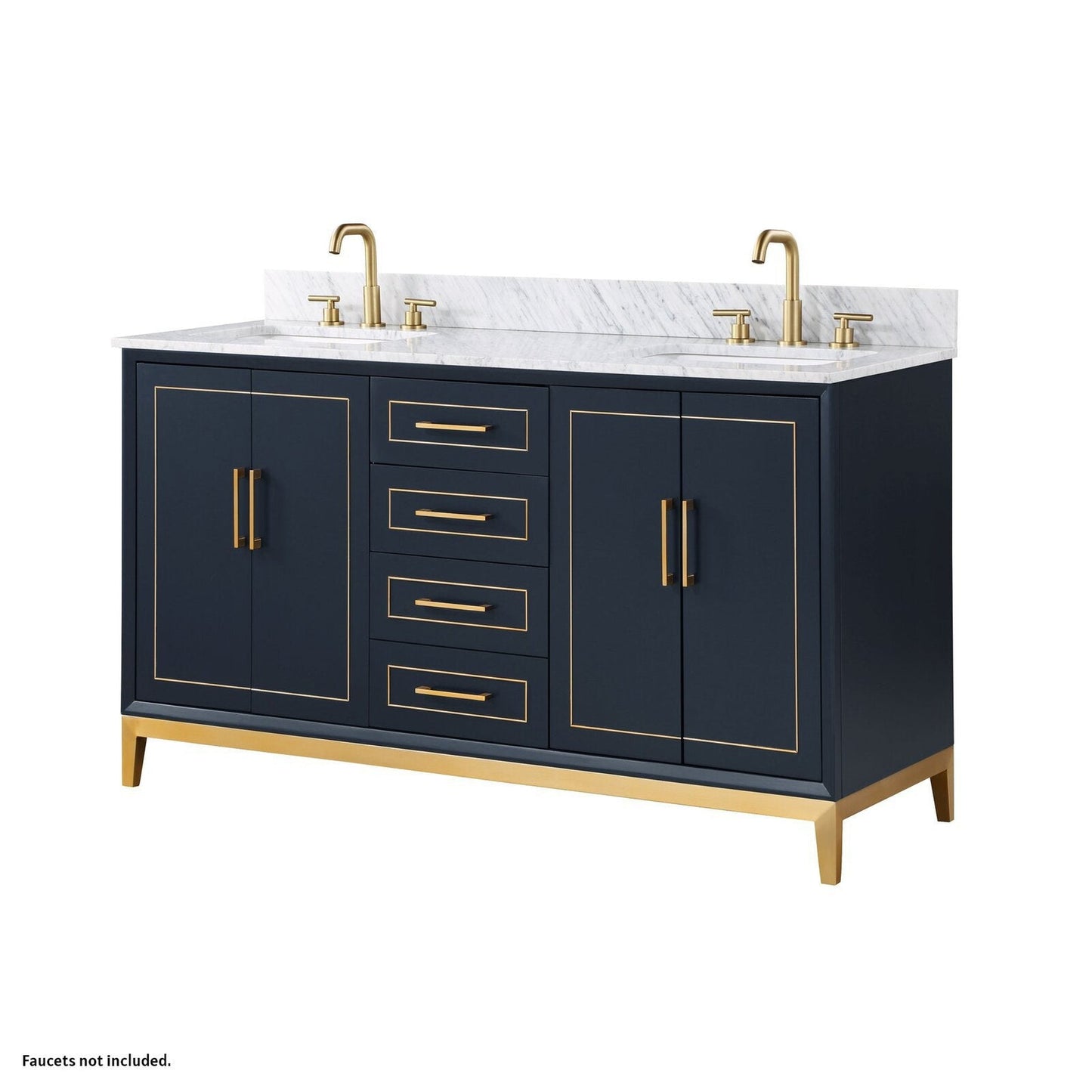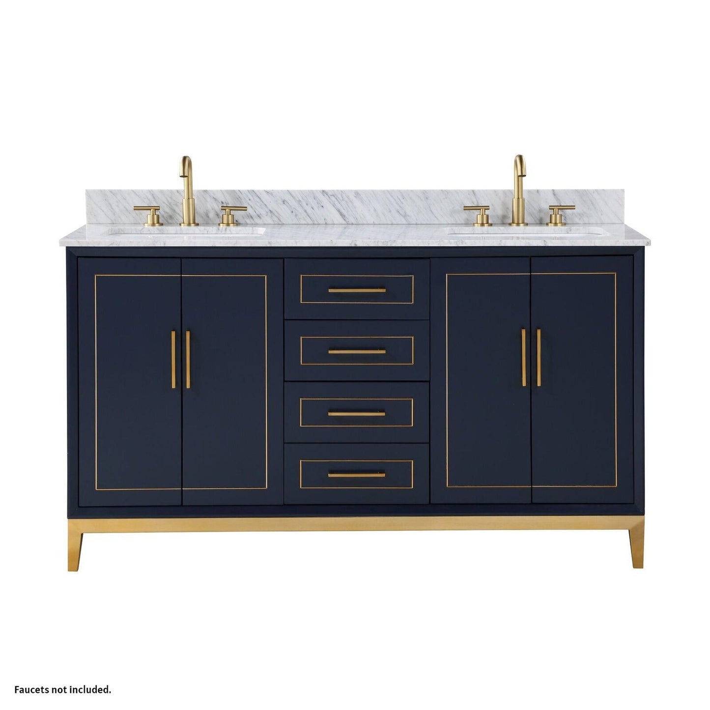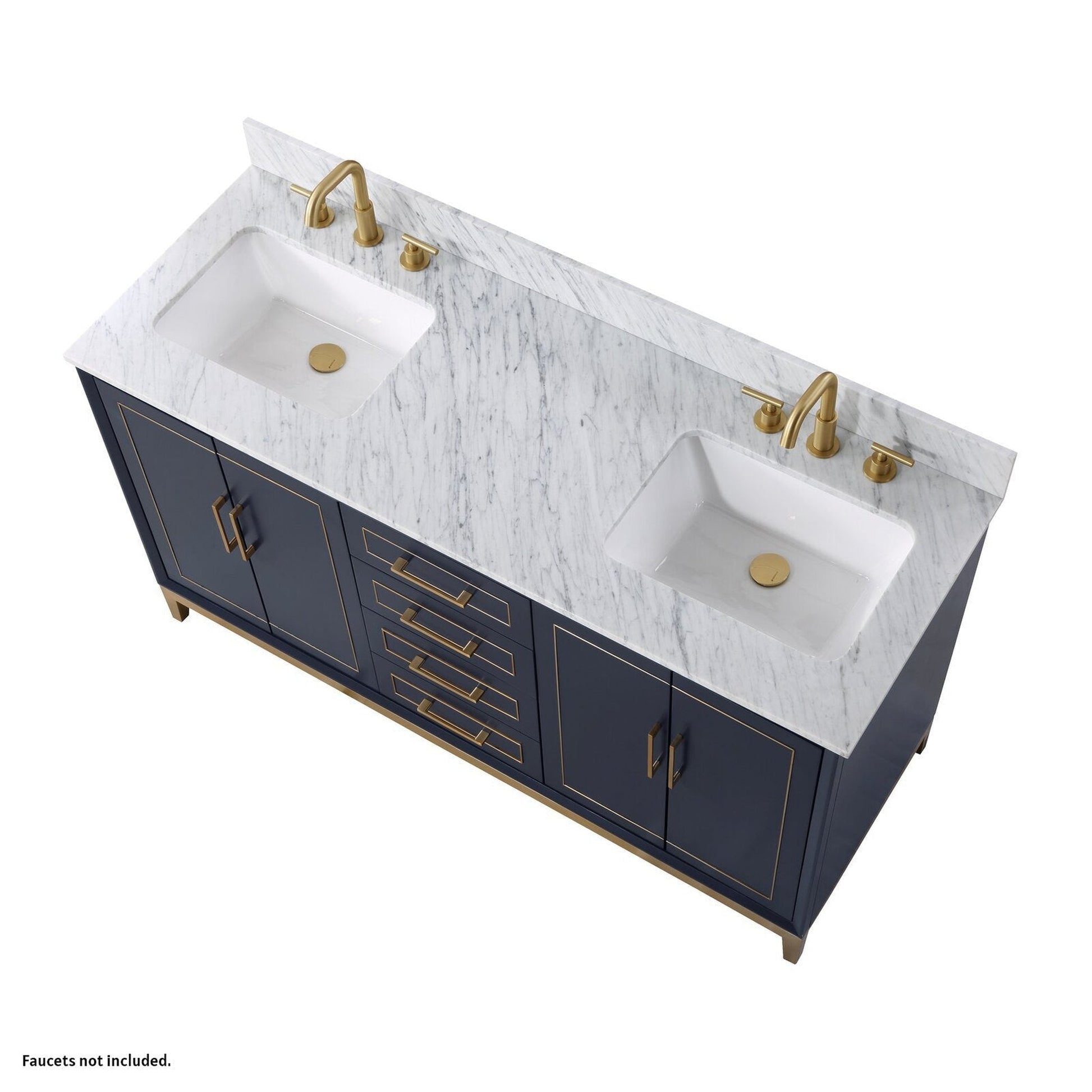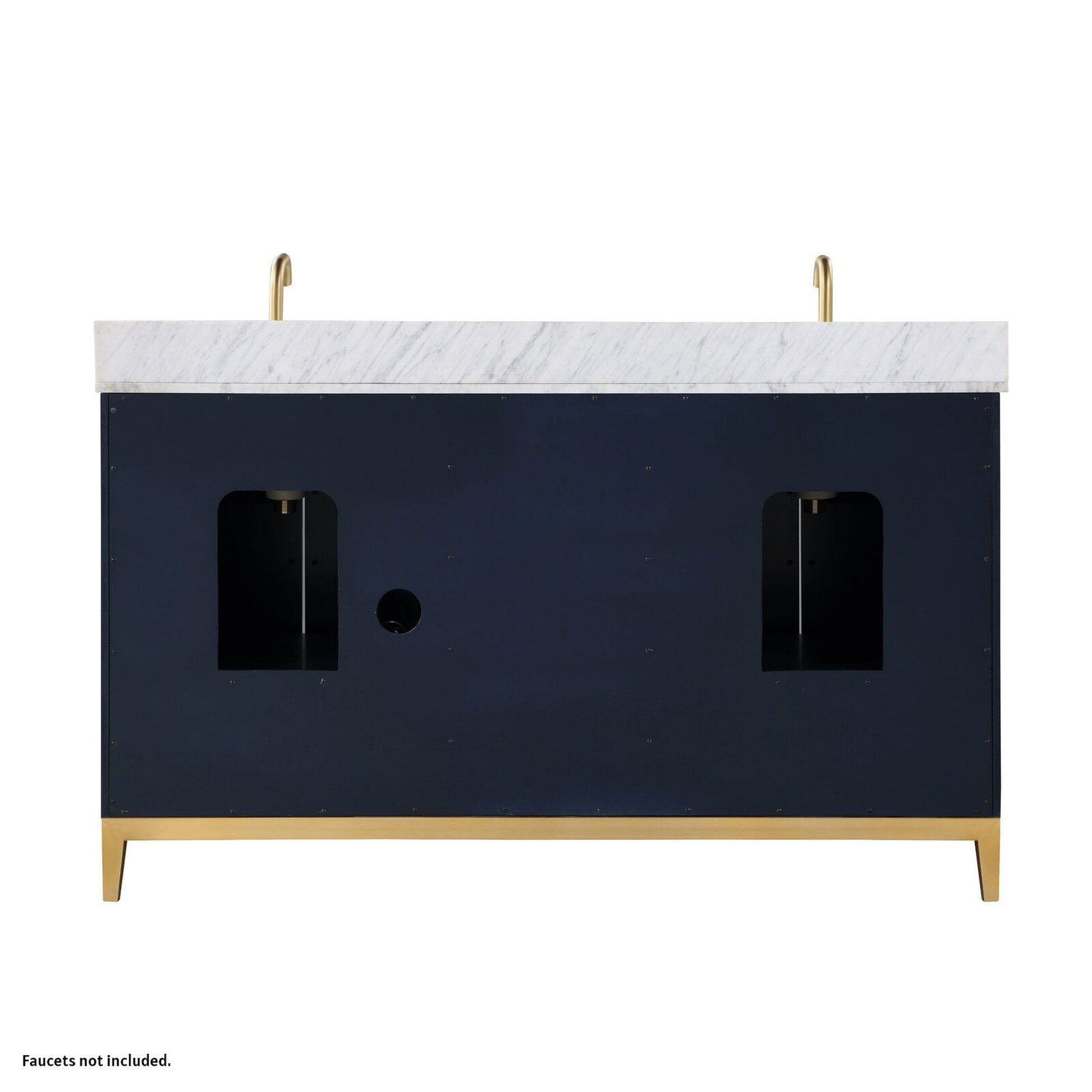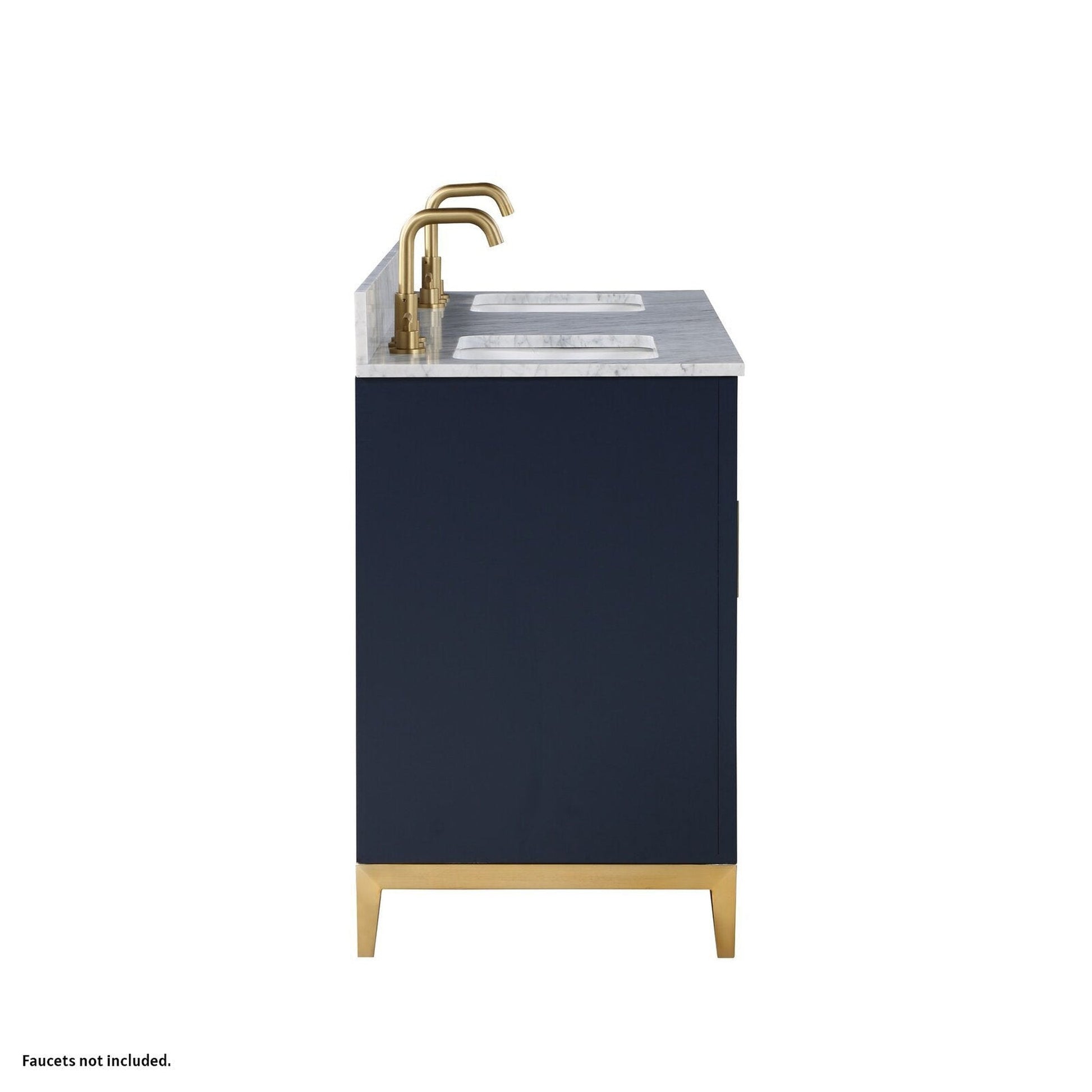 Bemma Design Gracie 60" Pacific Blue Solid Wood Freestanding Bathroom Vanity With Double 3-Hole Italian Carra Marble Vanity Top, Rectangle Undermount Sink, Backsplash and Satin Brass Trim