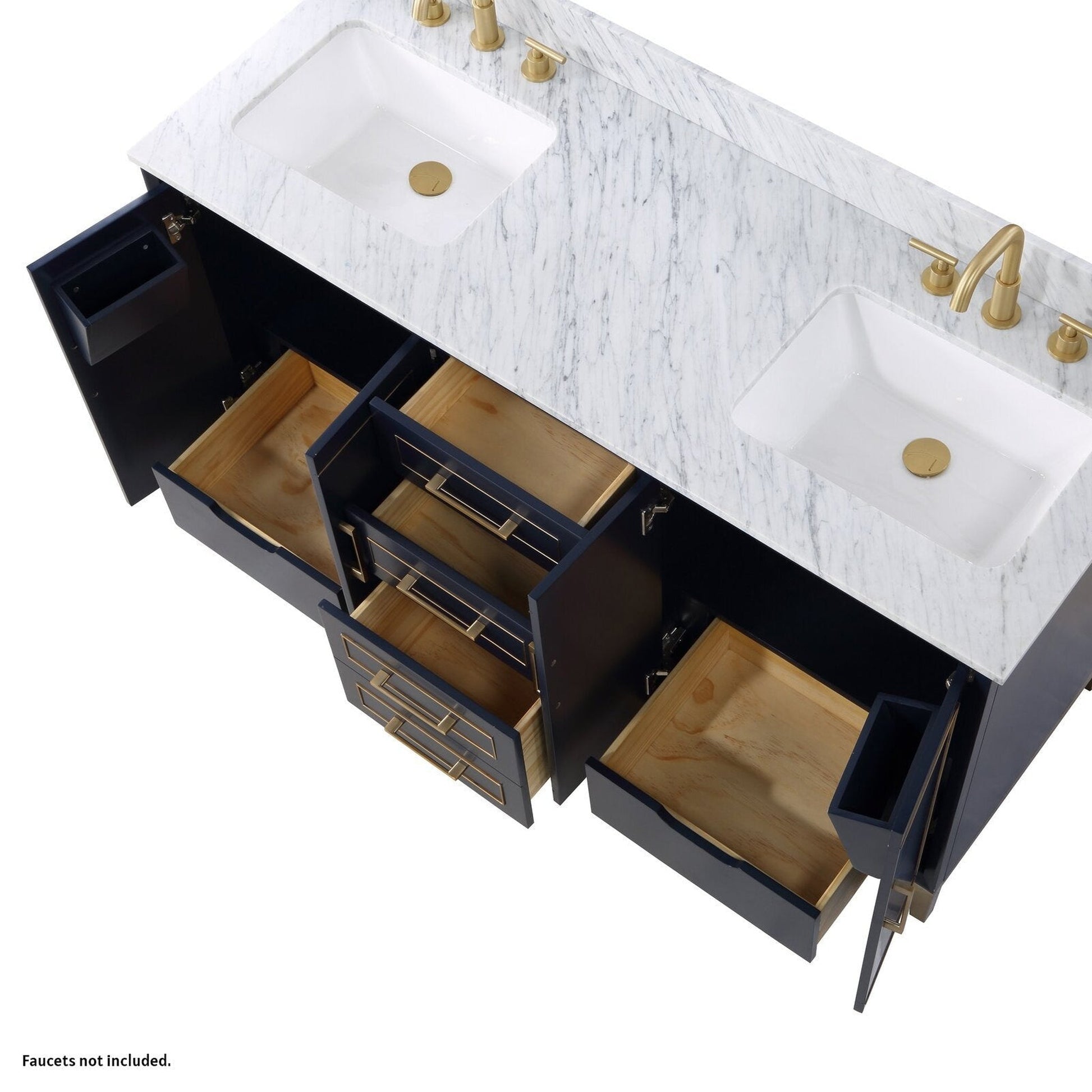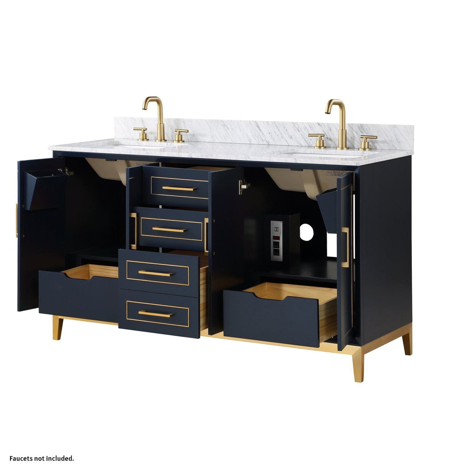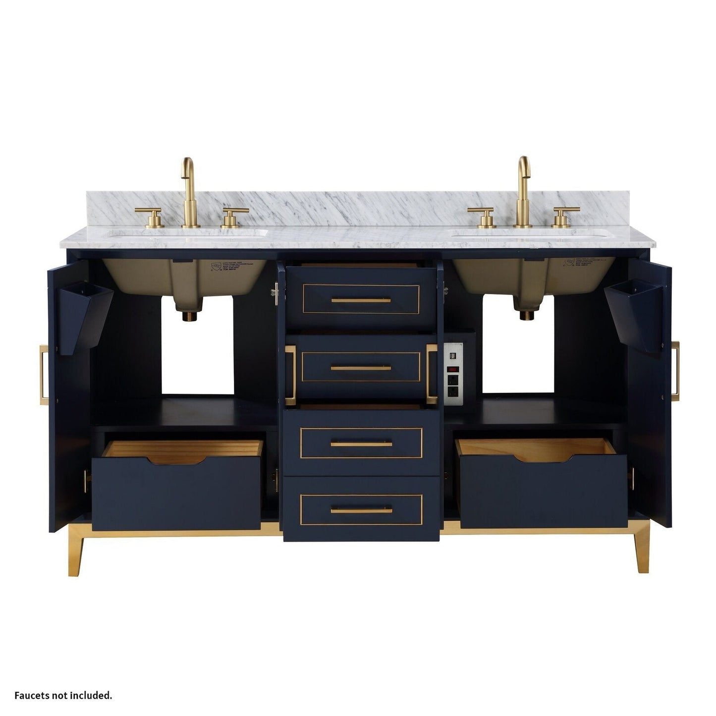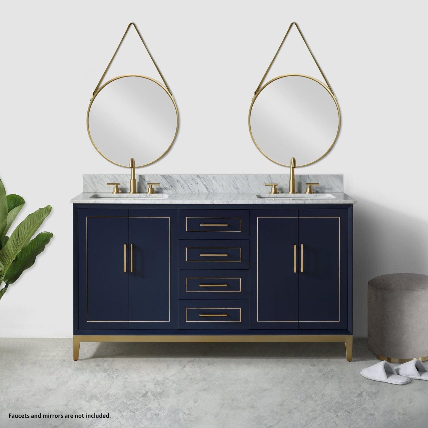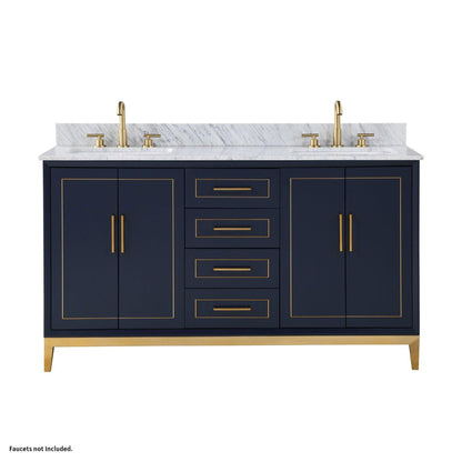Bemma Design Gracie 60" Pacific Blue Solid Wood Freestanding Bathroom Vanity With Double 3-Hole Italian Carra Marble Vanity Top, Rectangle Undermount Sink, Backsplash and Satin Brass Trim