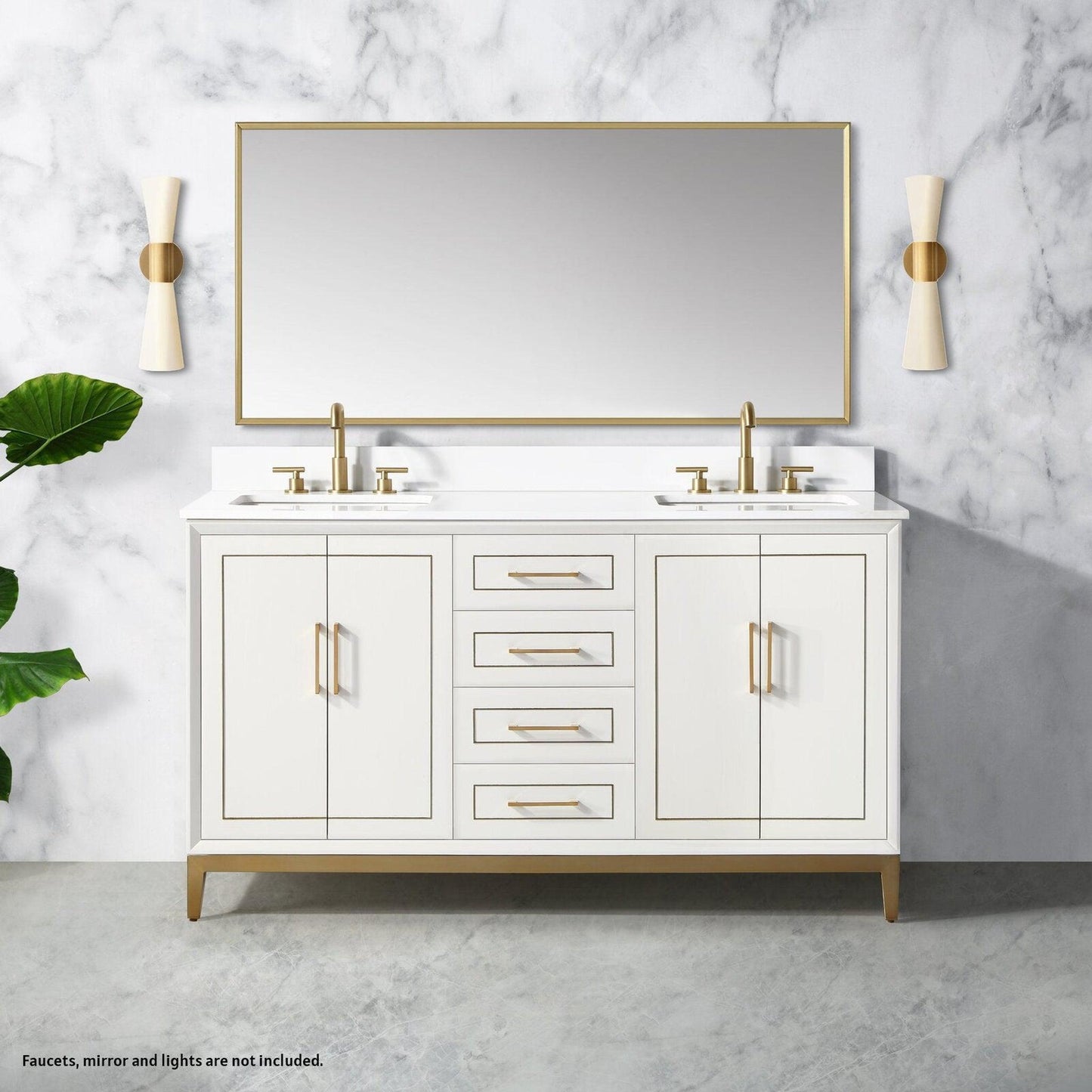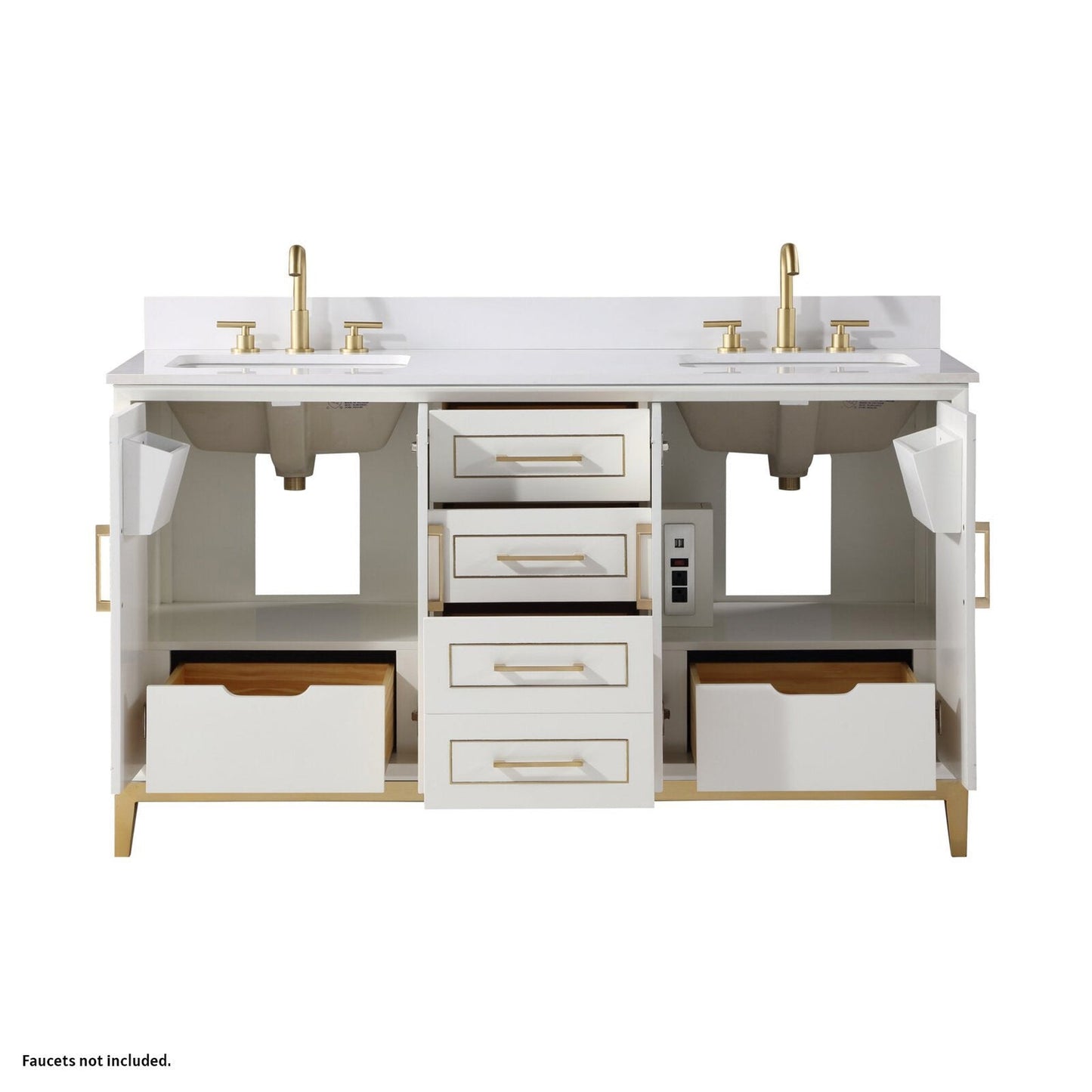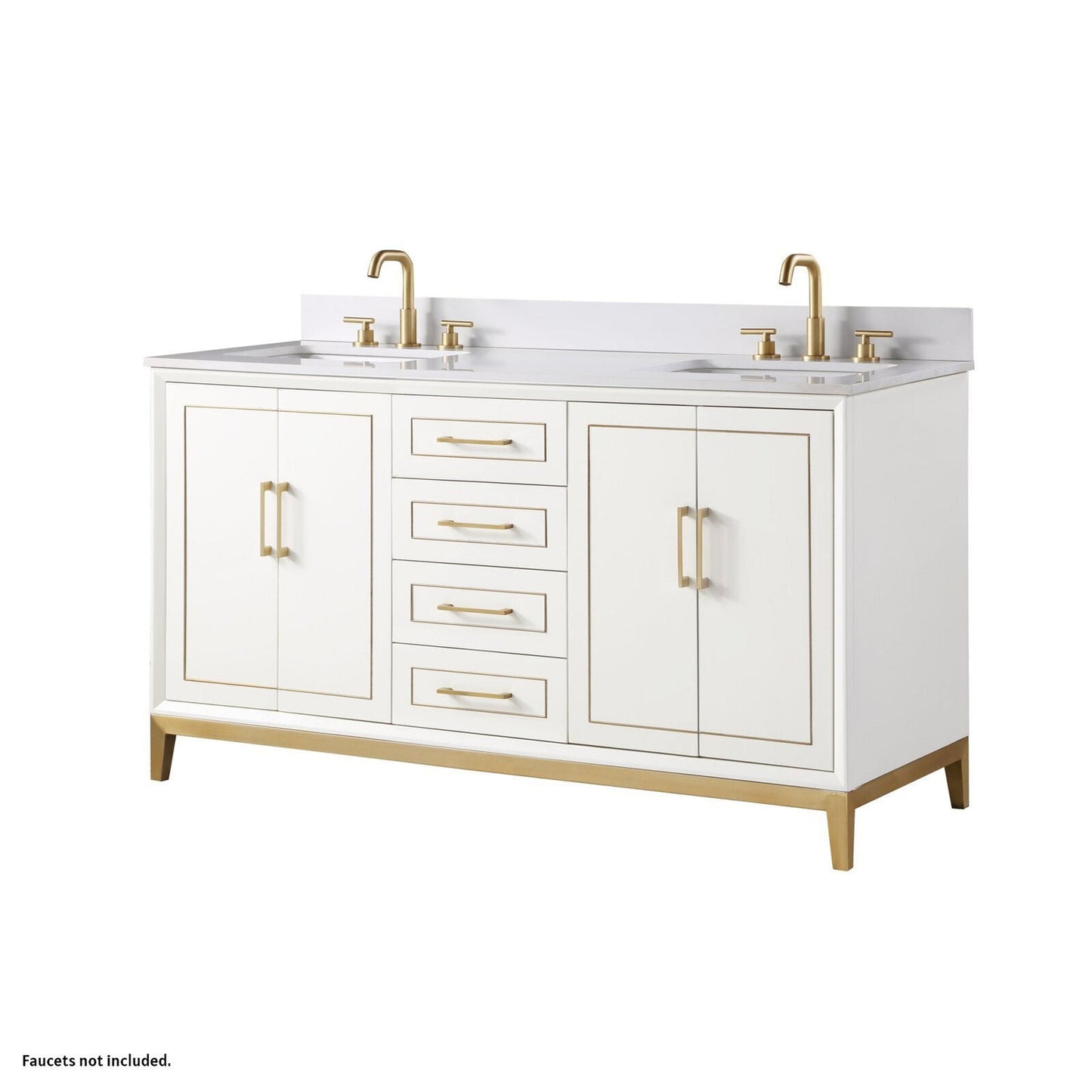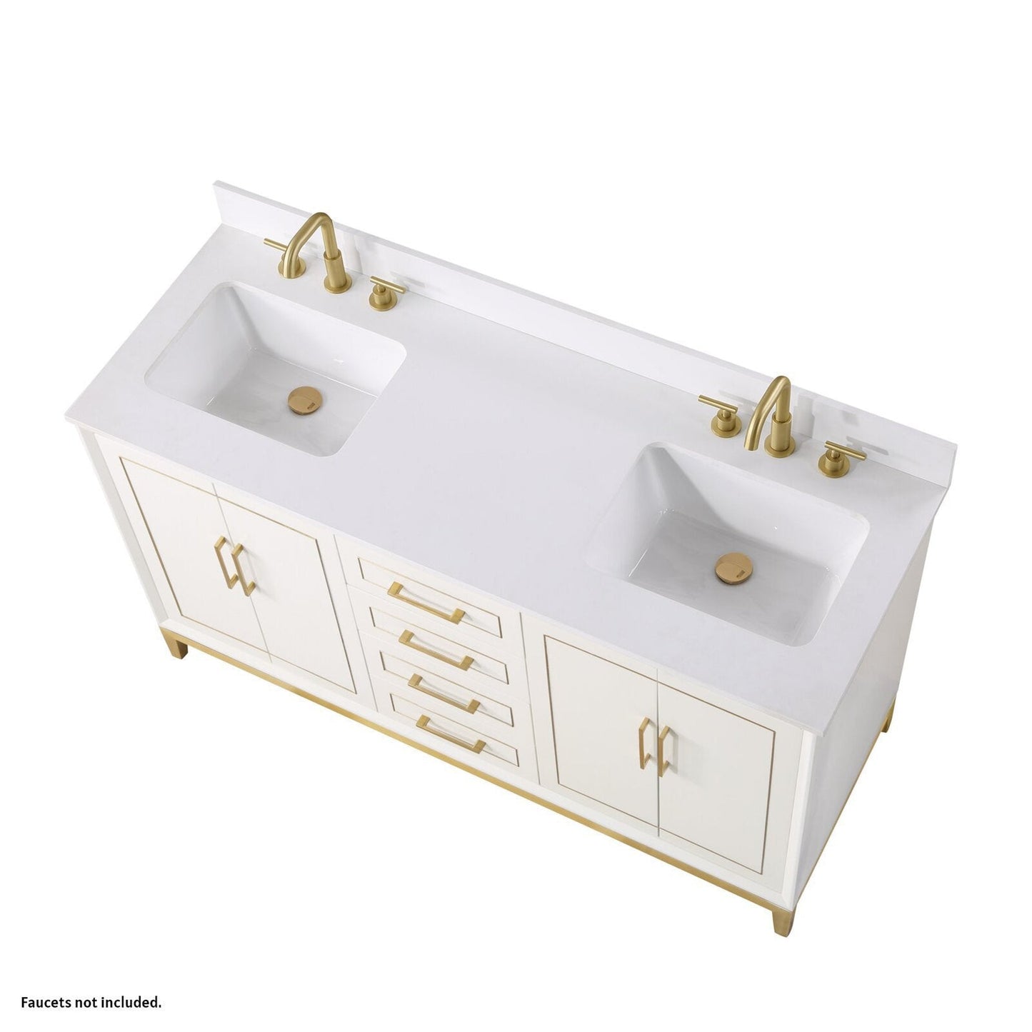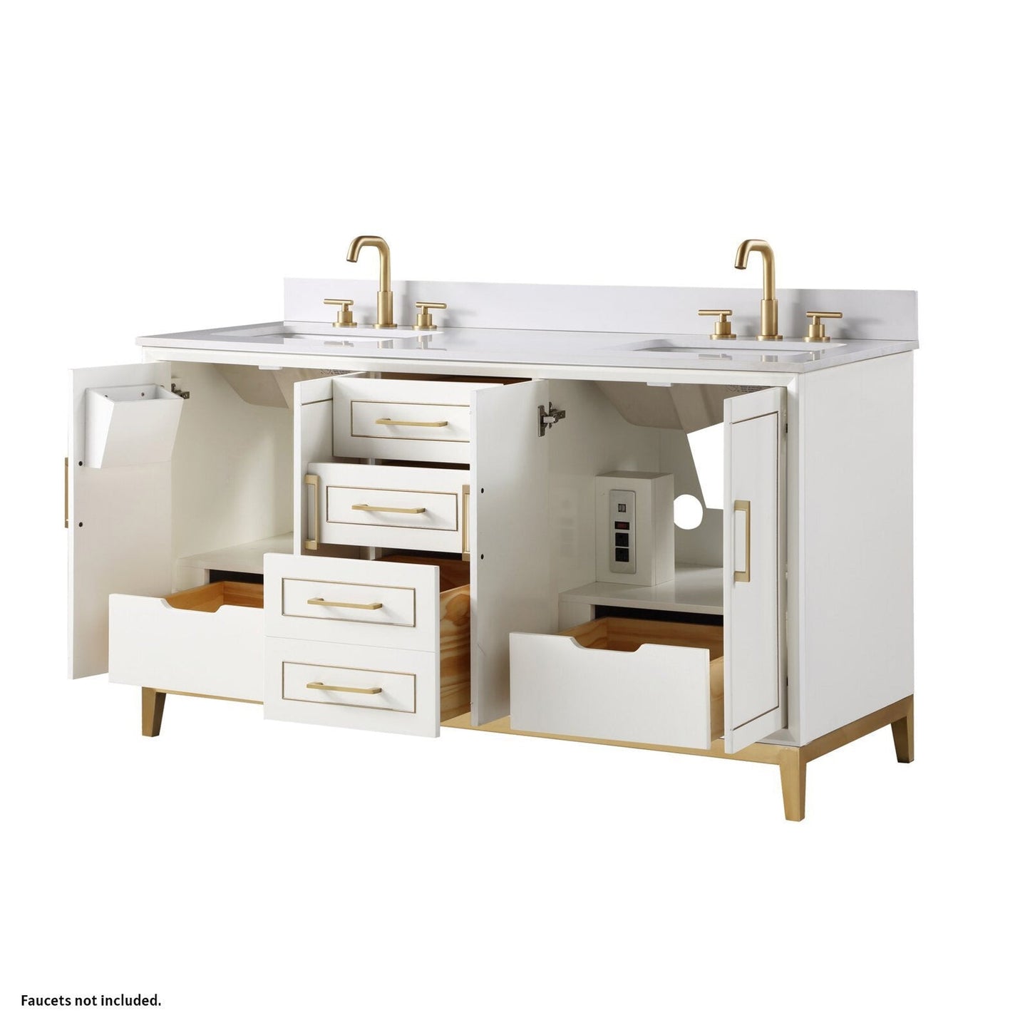 Bemma Design Gracie 60" Satin White Solid Wood Freestanding Bathroom Vanity With Double 3-Hole White Quartz Vanity Top, Rectangle Undermount Sink, Backsplash and Satin Brass Trim