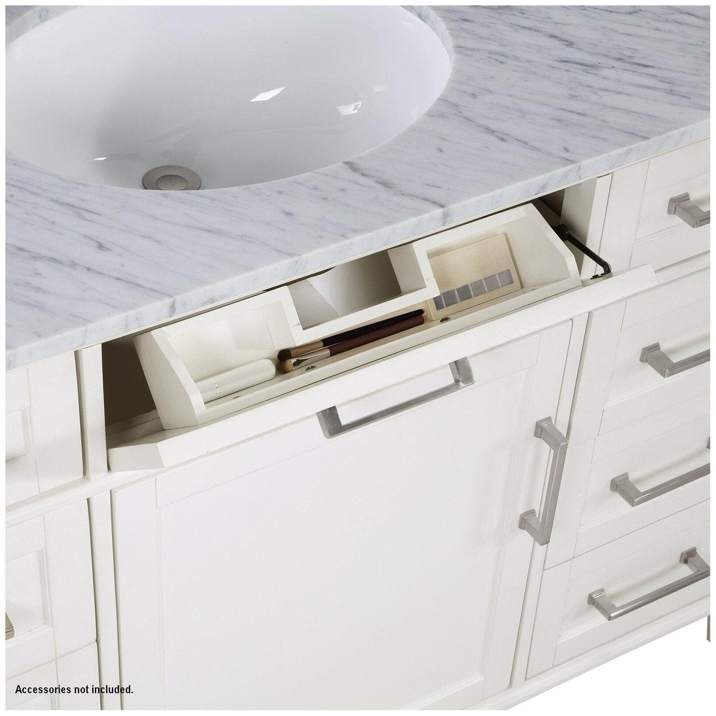 Premium soft-close glides/hinges deliver effortless motion while dovetailed joints provide seamless joinery. Detailed with brushed nickel accents and unassuming classic lines, the Montauk Bathroom Vanity is a sophisticated yet casual piece.