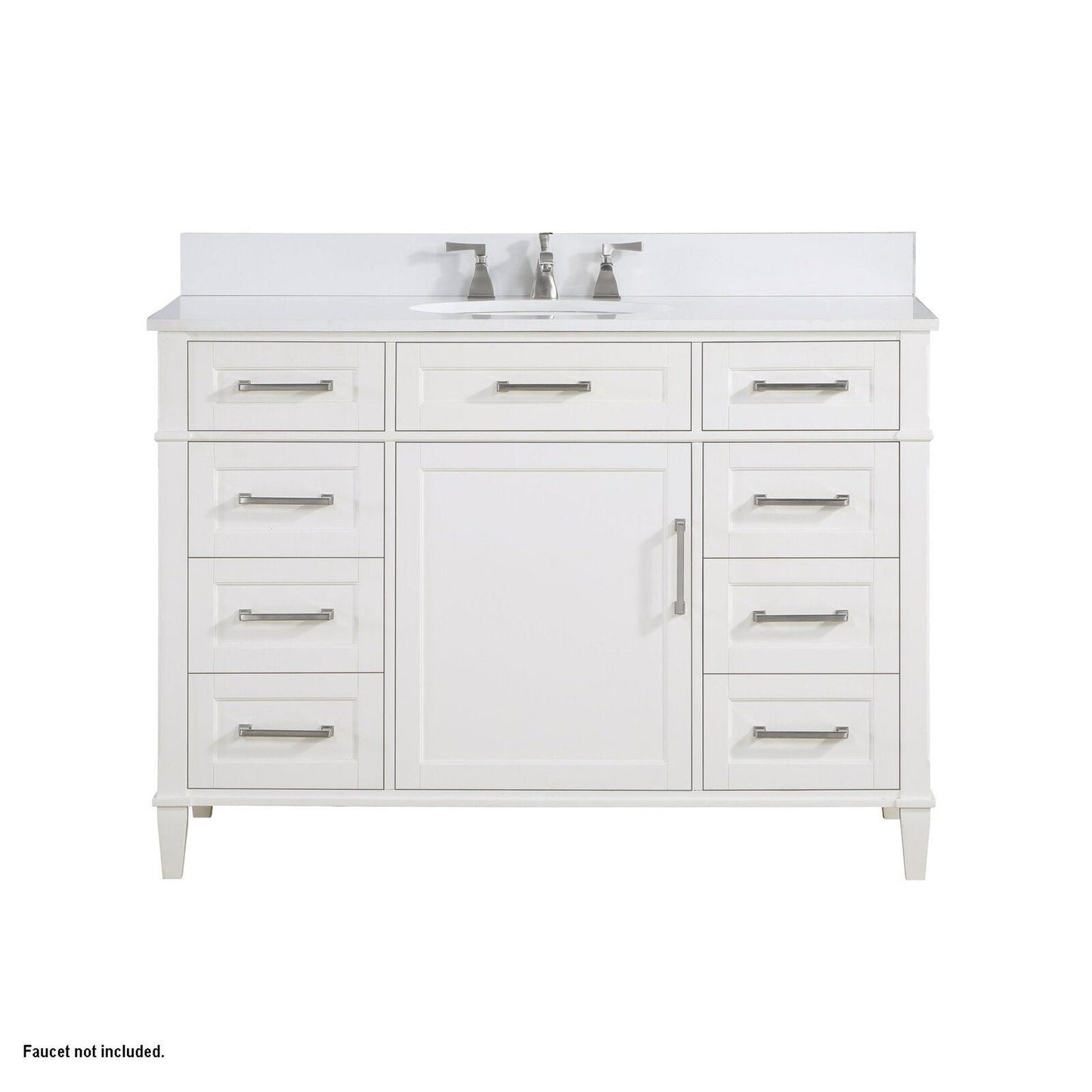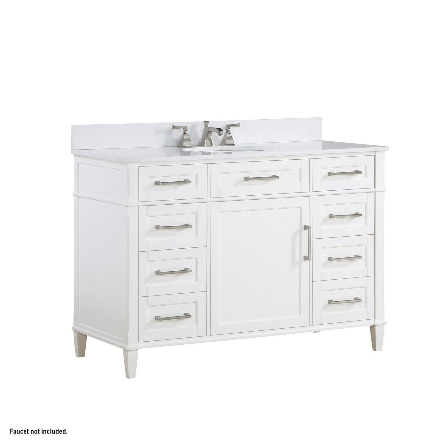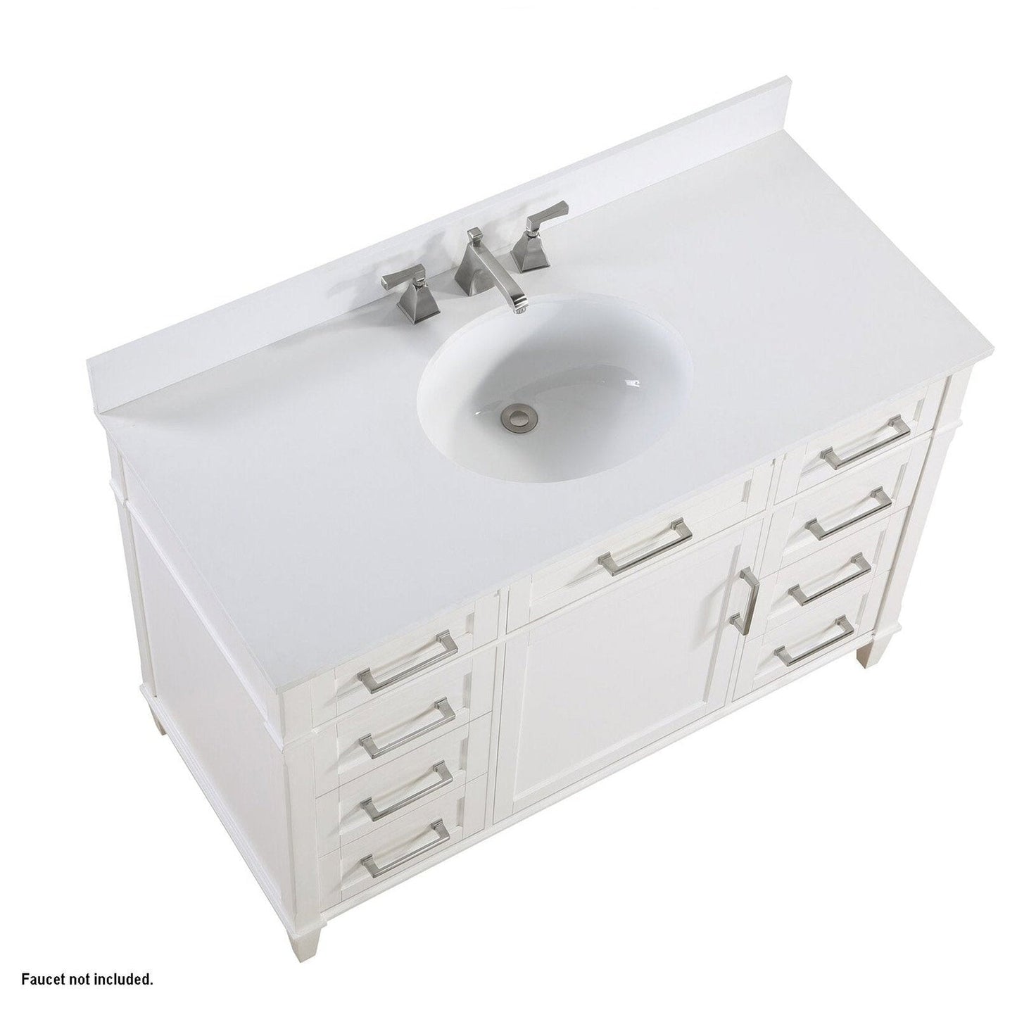 Bemma Design Montauk 48" Pure White Solid Wood Freestanding Bathroom Vanity With Single 3-Hole White Quartz Vanity Top, Oval Undermount Sink, and Backsplash