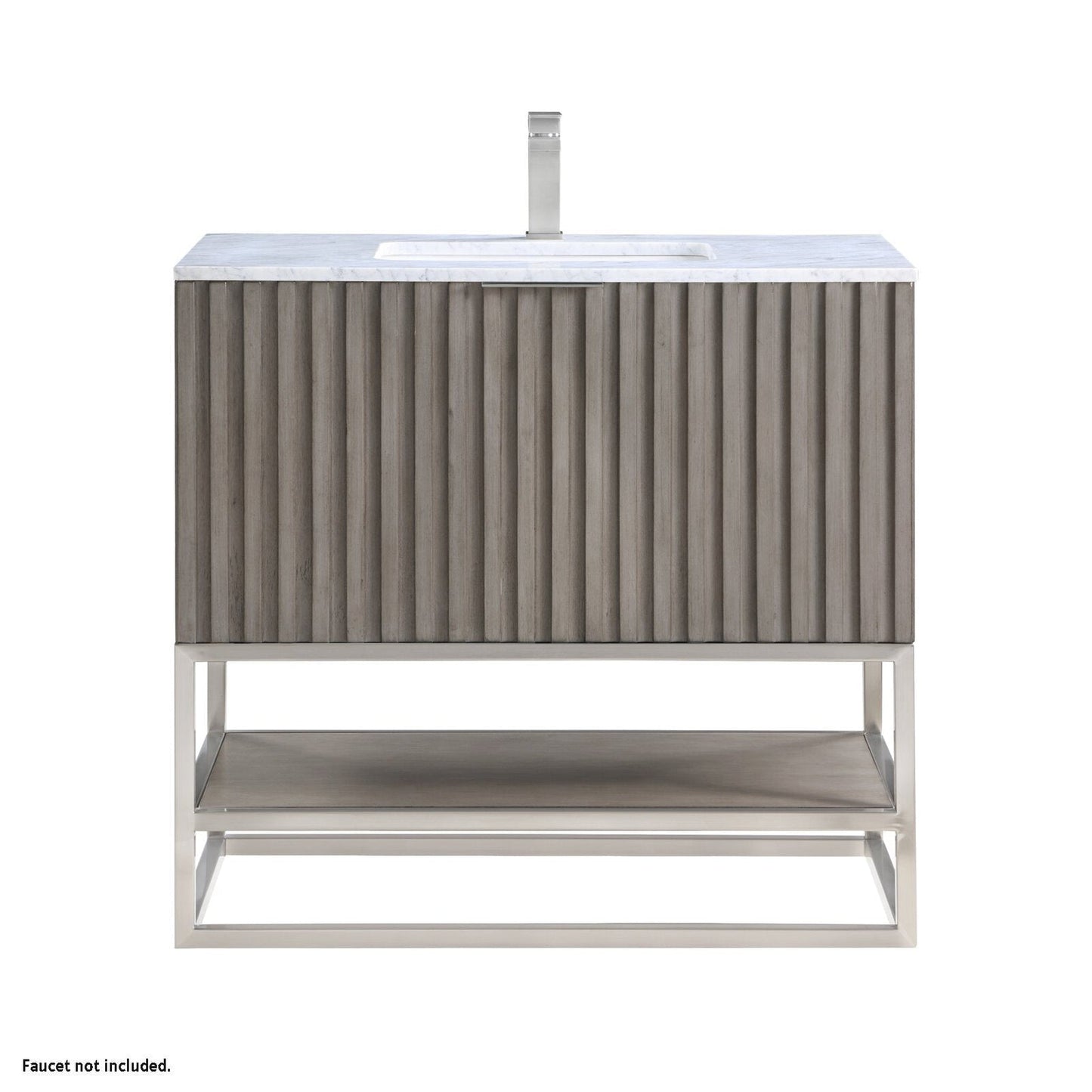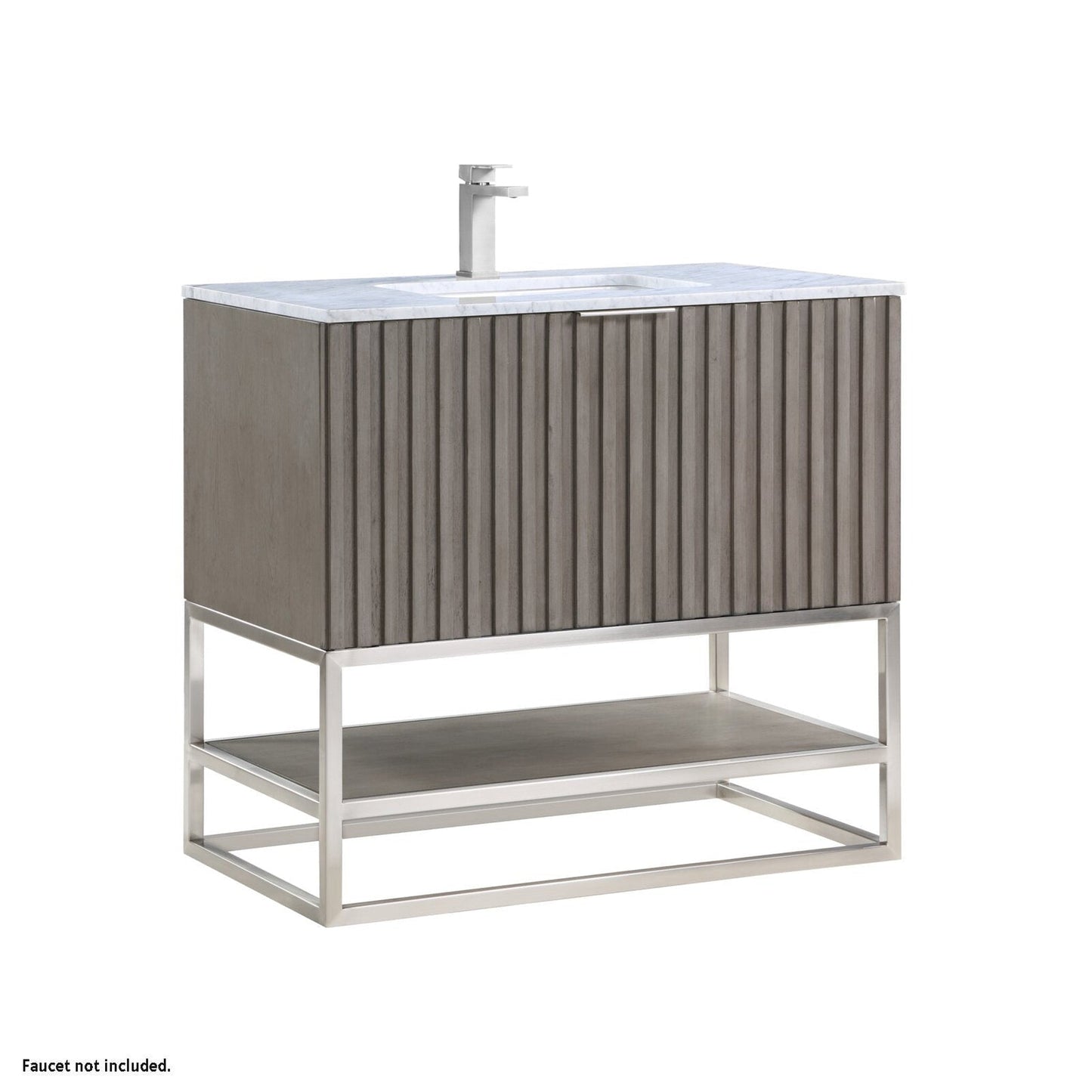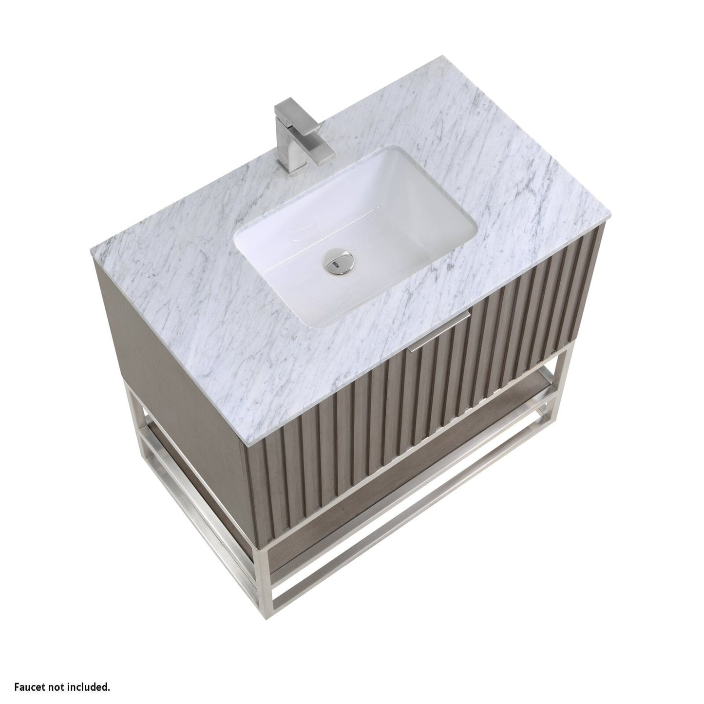 Bemma Design Terra 36" Graywash Solid Wood Freestanding Bathroom Vanity With Single 1-Hole Italian Carra Marble Vanity Top, Rectangle Undermount Sink and Brushed Nickel Trim