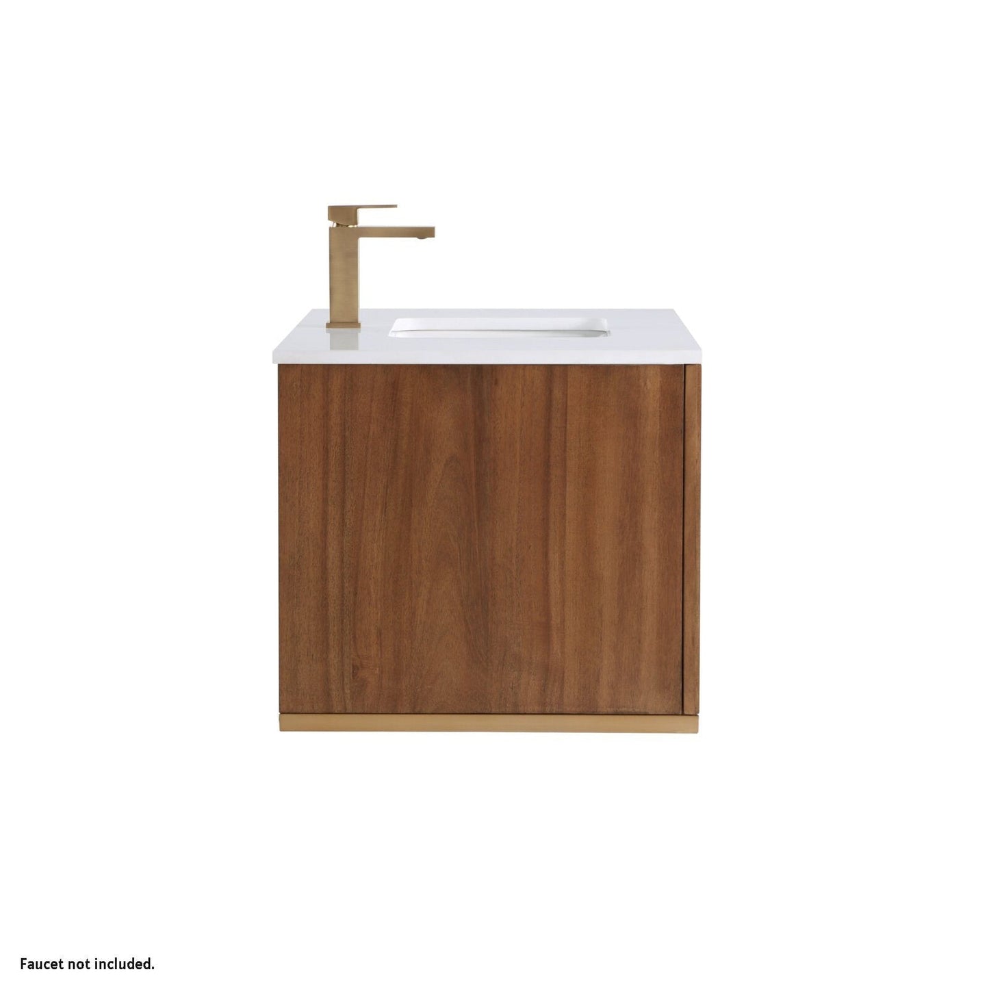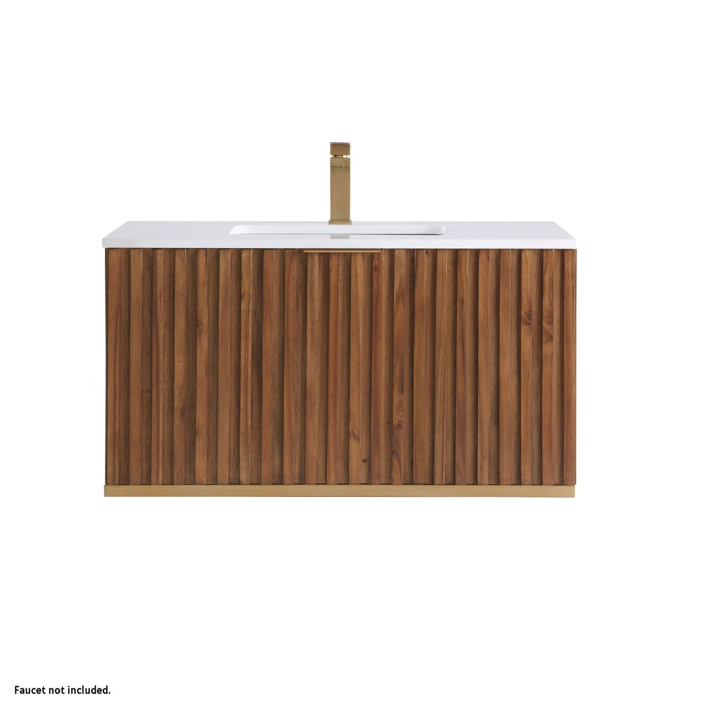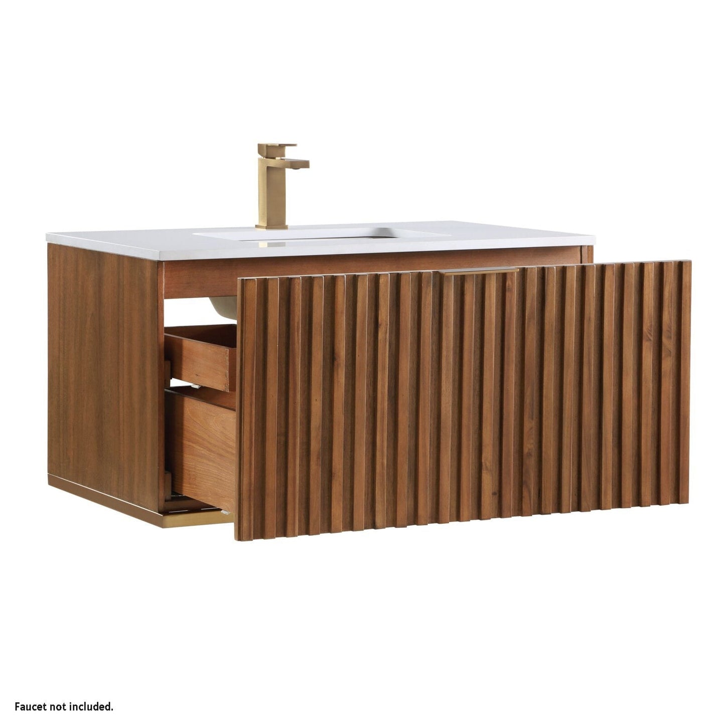 Bemma Design Terra 36" Walnut Solid Wood Wall-Mounted Bathroom Vanity With Single 1-Hole White Quartz Vanity Top, Rectangle Undermount Sink and Satin Brass Trim