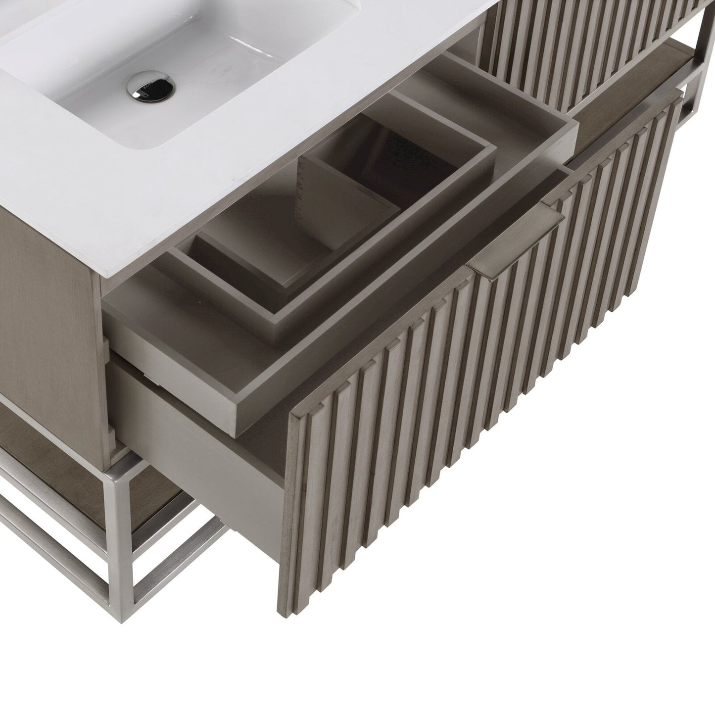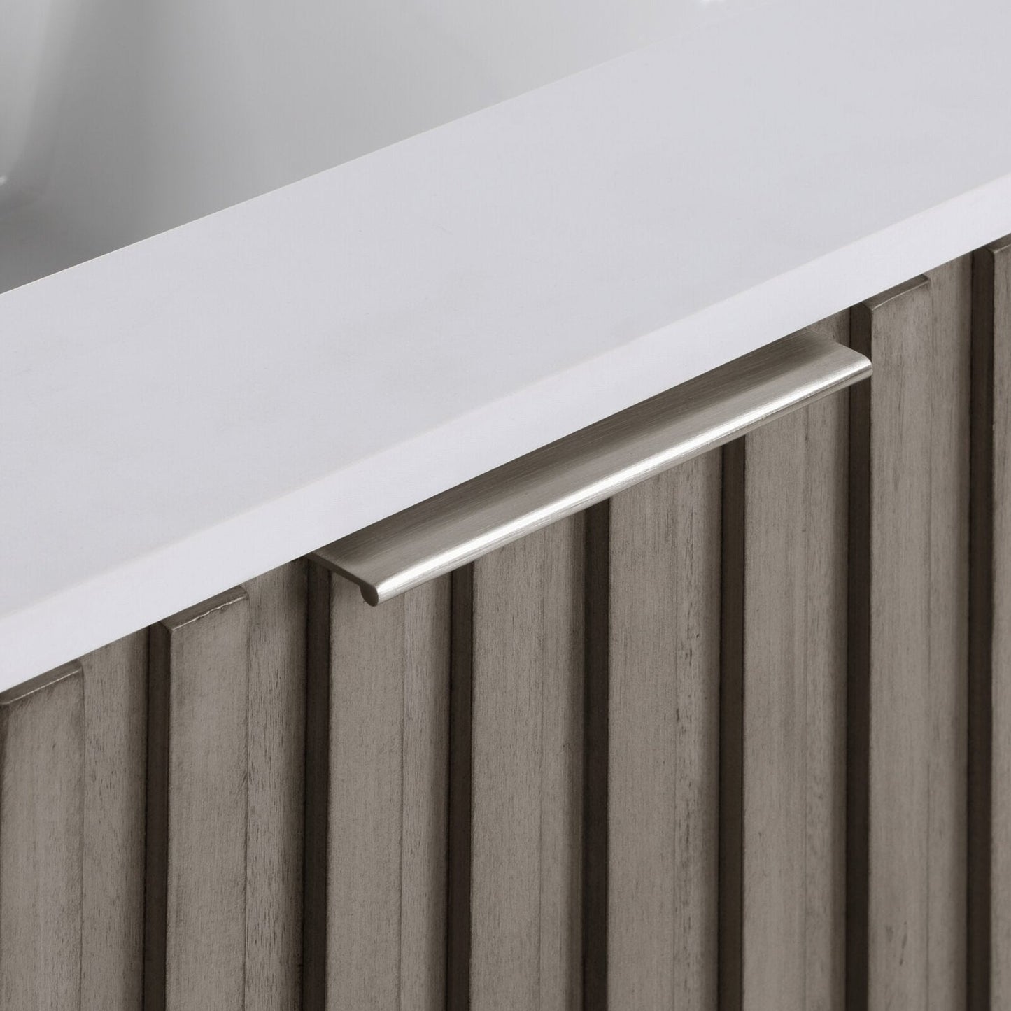 Uniquely fluted design façade in wash veneer will add a sleek and bold look to any bathroom. Floor models are designed with a handsome, durable, and functional integrated storage shelf. The vanity’s deep soft-close and interior pullout drawers are complemented with a matching finish allowing for an easy-to-clean environment. Premium Blum glides deliver an effortless motion while the dovetailed joints provide seamless joinery.