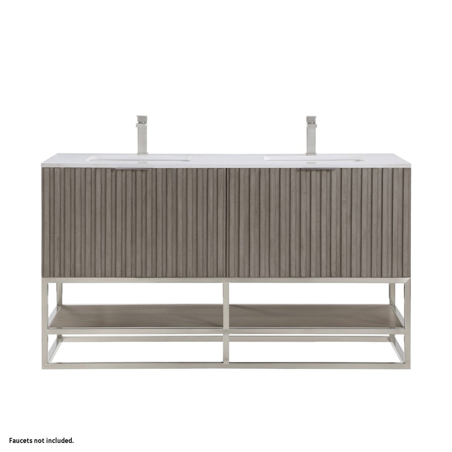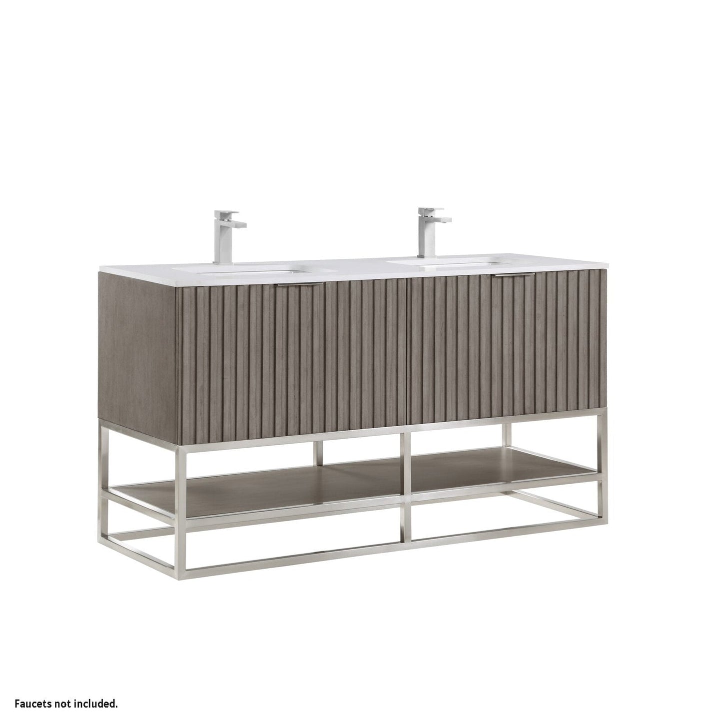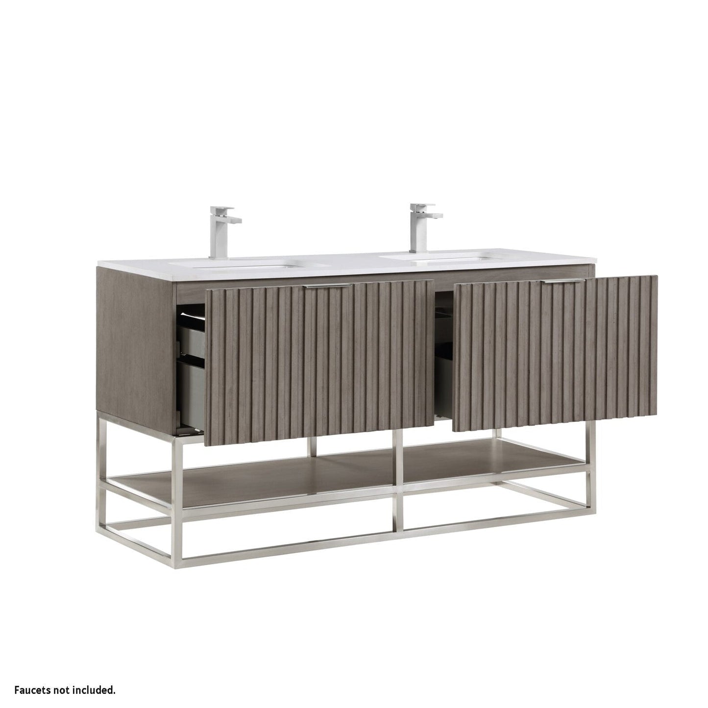 Bemma Design Terra 60" Graywash Solid Wood Freestanding Bathroom Vanity With Double 1-Hole White Quartz Vanity Top, Rectangle Undermount Sink and Brushed Nickel Trim