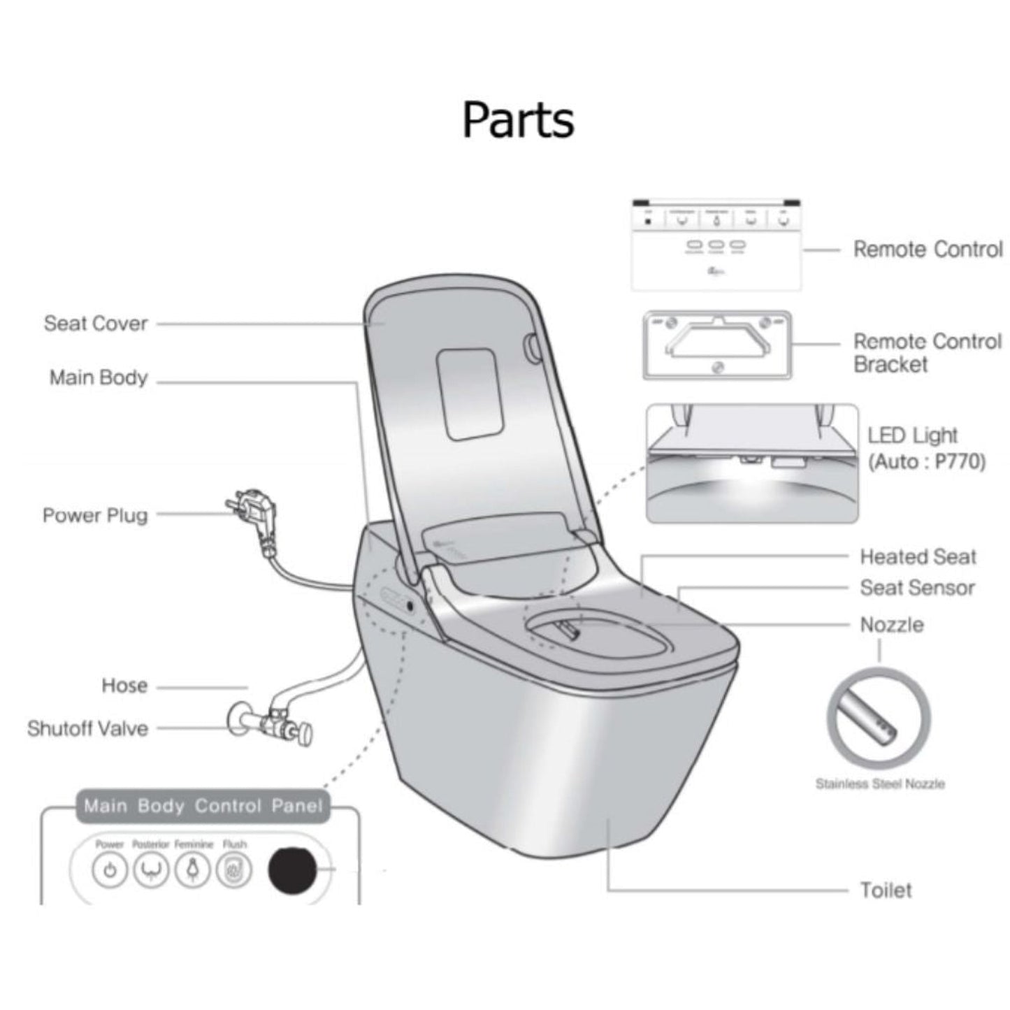 Bidet seat models come with complete a seat assembly where your toilet seat and lid will be replaced. Bidet seats will convert your toilet into a bidet toilet in minutes. The seat and lid are hydraulic for soft closing and made of fire-retardant ABS resin. Bidet attachments are bidet units which mount between your existing toilet and toilet seat. A side control panel is placed on right side of user to operate the attached nozzle which extracts for washing only when in use. Nozzles are normally hidden behind splash guards when not in use. Seat : BB-i3000 Bidet Attachment: BBC-70, BBC-250, Elite3
