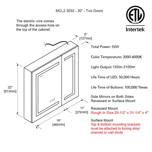 A: For detailed LED Medicine Cabinet measurements and rough-in size, please refer to our detailed diagrams.