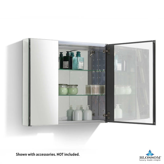 Blossom's stylish medicine cabinets are made from Rust Free Stainless Aluminum materials with interchangeable left or right-hinged frameless doors. Optional recess or surface-mounted installations are made possible to compliment a variety of different bathroom styles with easy side mirror removal for recess installations. Multiple levels of adjustable glass shelves are fashioned to allow toiletries and bath items to be hidden. The interior and exterior consist of entirely mirrored surfaces on all the inside doors, back of the cabinet, and the sides of the cabinet protected with soft closure enhancements which offer a useful arrangement of versatility. Blossom's medicine cabinets come in a variety of sizes to fit your bathroom needs.