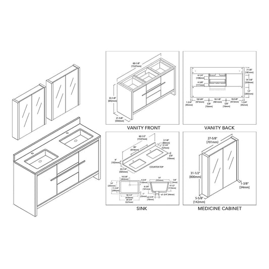 Blossom Milan 60" 2-Door 3-Drawer White Freestanding Vanity With Ceramic Drop-In Single Sink And Mirrored Medicine Cabinet