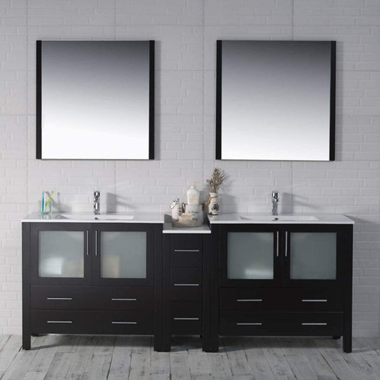 Blossom Sydney 84" Espresso Freestanding Vanity Set With Ceramic Top, Integrated Double Sinks and Mirror