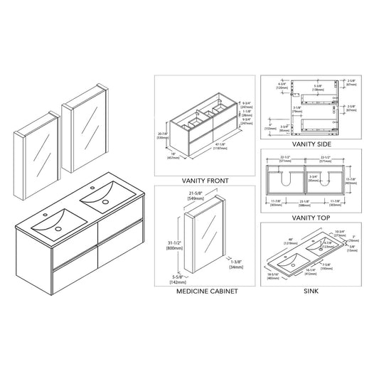 Blossom Valencia 48" 2-Drawer White Wall-Mounted Vanity Set With Ceramic Top and Integrated Single Sink and Medicine Cabinet