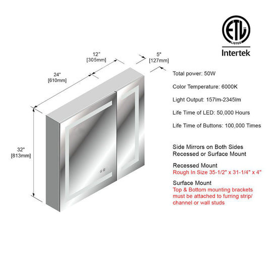 Blossom Vega 36" x 32" Recessed or Surface Mount 2-Door LED Mirror Medicine Cabinet With 3 Adjustable Glass Shelves and Built-In Defogger