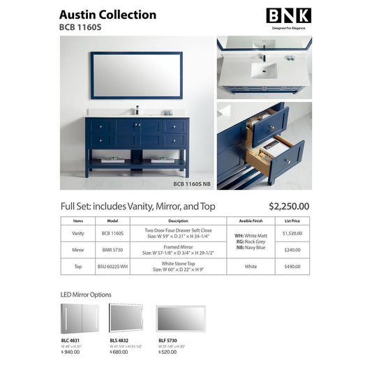 BNK BCB1160S Austin Navy Blue Vanity With Single Sink Only Two Door Four Drawer Soft Close