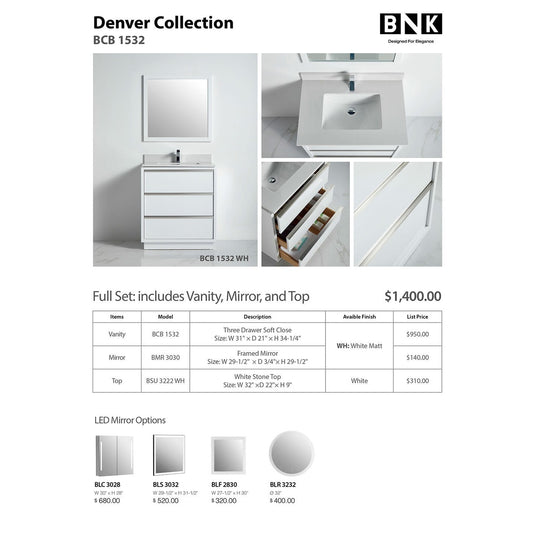 BNK BCB1532WH Denver Matt White Vanity Only Three Drawer Soft Close