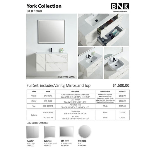 BNK BCB1940WMG York White Mable Grain Vanity Only One-Door Two Drawer Soft Close