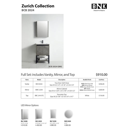 BNK BCB2024GMG Zurich Grey Mable Grain Vanity Only Two-Door Soft Close