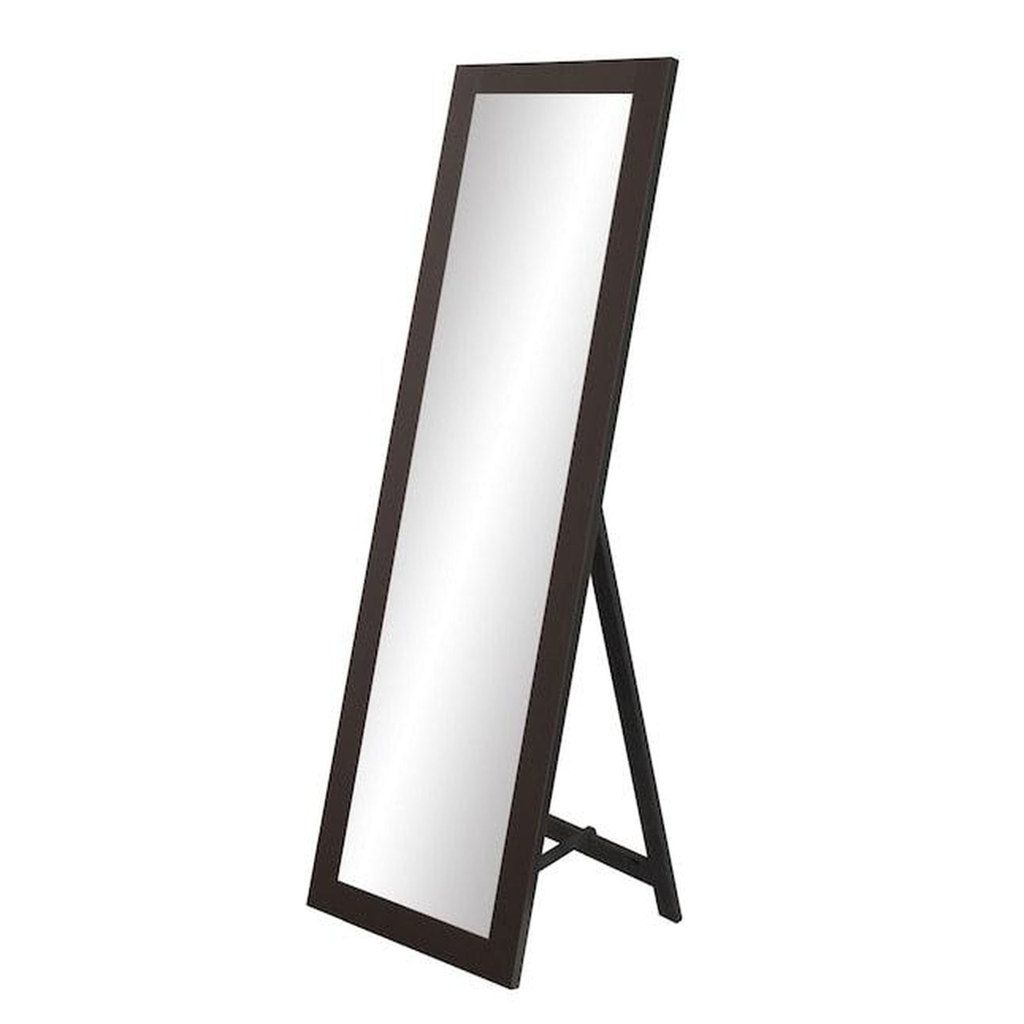 Created to enhance the functionality and style in your home, this modern matte black freestanding floor mirror is an impressive accessory to stand in your bedroom, bathroom or living space. This ultra modern frame style is the perfect piece to add a touch of glam and drama to your space. The 21.5 x 71 inch full length mirror comes installed with a black non adjustable stand. The full body height is an ideal dressing size with a head to toe mirrored view. The stand measures 17.5 inches from the back of the mirror and is already installed for an easy no assembly set up.