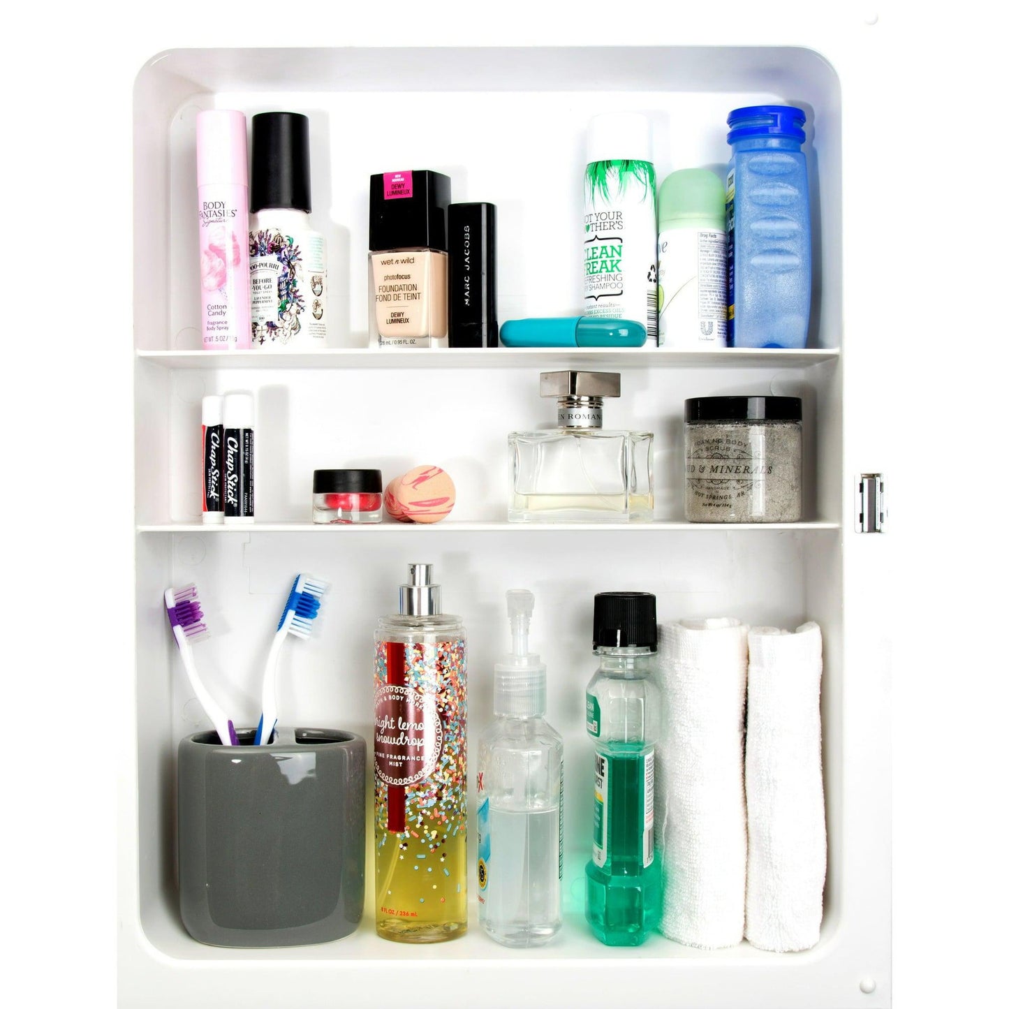 Upgrade your vanity's style using a fashionably framed medicine cabinet. The single swing door mirror is custom fitted with a 2 inch MDF decorative frame which adds character and function to any small space. This white plastic formed cabinet can be surface mounted or recessed into the wall (wall opening: 13 3/8 x 17.5 inches). The overall unit including the frame measures 21 inches tall x 17 inches wide x 4 5/8 inches in depth from the wall when surface mounted. The right opening mirrored door is installed with concealed piano hinges and magnet-close hardware. The back of the mirrored door is sealed with a white, wipe clean backing. The interior displays three, easy to clean fixed shelves. Each shelf measures 13.25 inches wide x 3 inches in depth. This medicine cabinet will arrived fully assembled with drywall anchors and screws included for a simple installation. Made and shipped from the United States.
