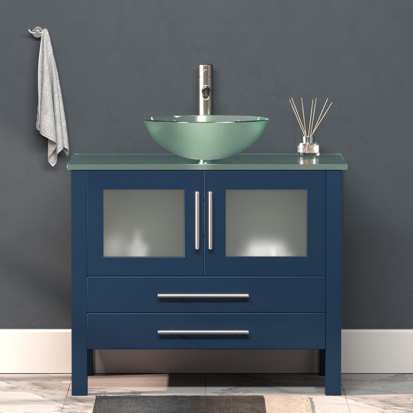This bathroom vanity set has a stylish blue cabinet made of solid wood with a tempered glass countertop and vessel sink. There are two soft-close doors and drawers and a single stem faucet is also included in the set.