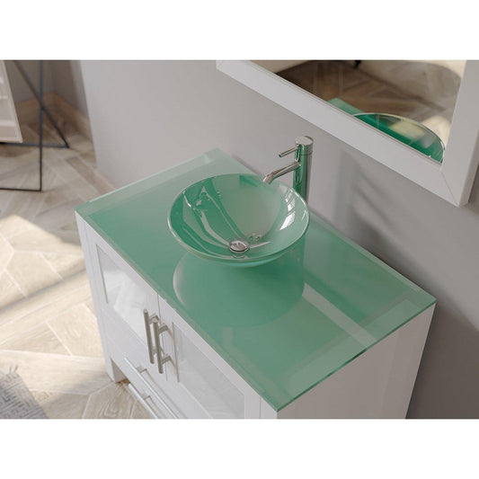 Cambridge Plumbing 36" White Wood Single Vanity Set With Tempered Glass Countertop And Circular Vessel Sink With Polished Chrome Plumbing Finish
