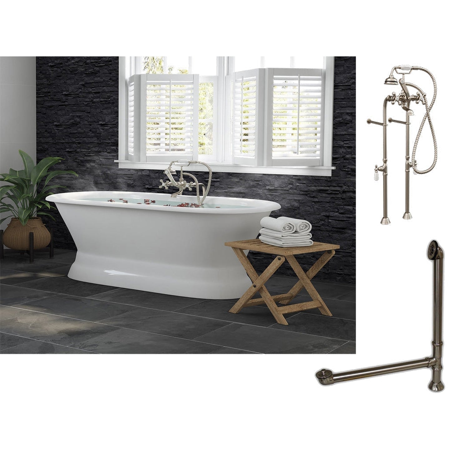 Cambridge Plumbing 60" White Cast Iron Double Ended Pedestal Bathtub With No Deck Holes And Complete Plumbing Package Including Floor Mounted British Telephone Faucet, Drain And Overflow Assembly In Brushed Nickel