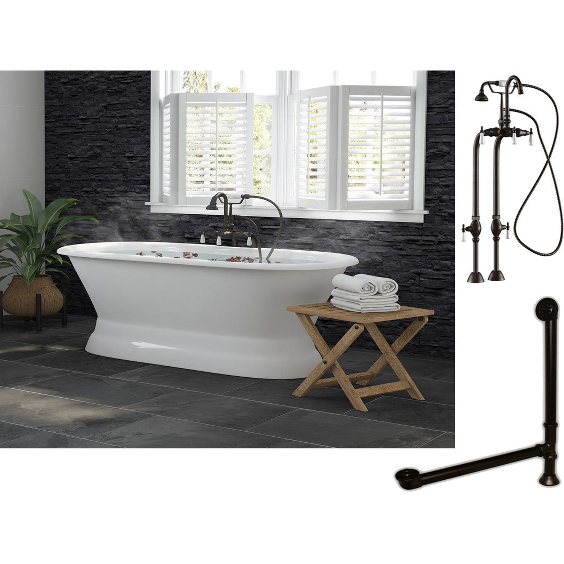 Cambridge Plumbing 60" White Cast Iron Double Ended Pedestal Bathtub With No Deck Holes And Complete Plumbing Package Including Freestanding English Telephone Gooseneck Faucet, Drain And Overflow Assembly In Oil Rubbed Bronze
