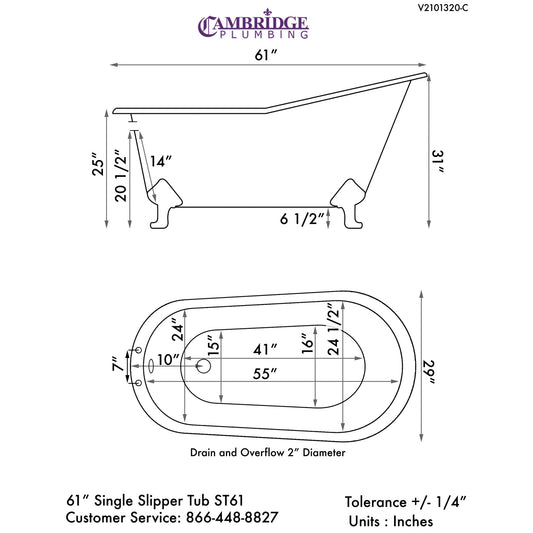 Cambridge Plumbing 61" White Cast Iron Clawfoot Bathtub With Deck Holes With Oil Rubbed Bronze Feet