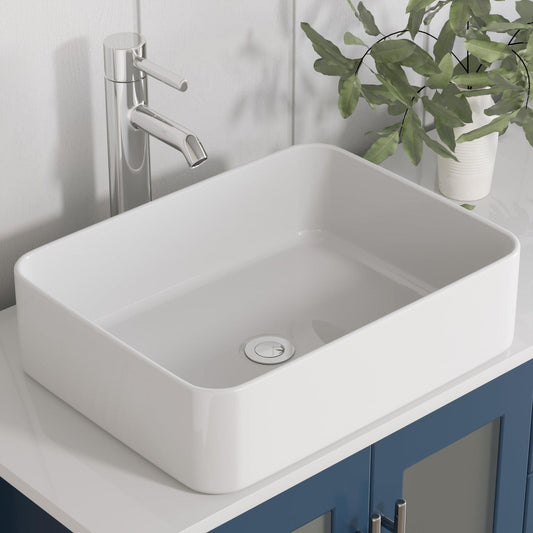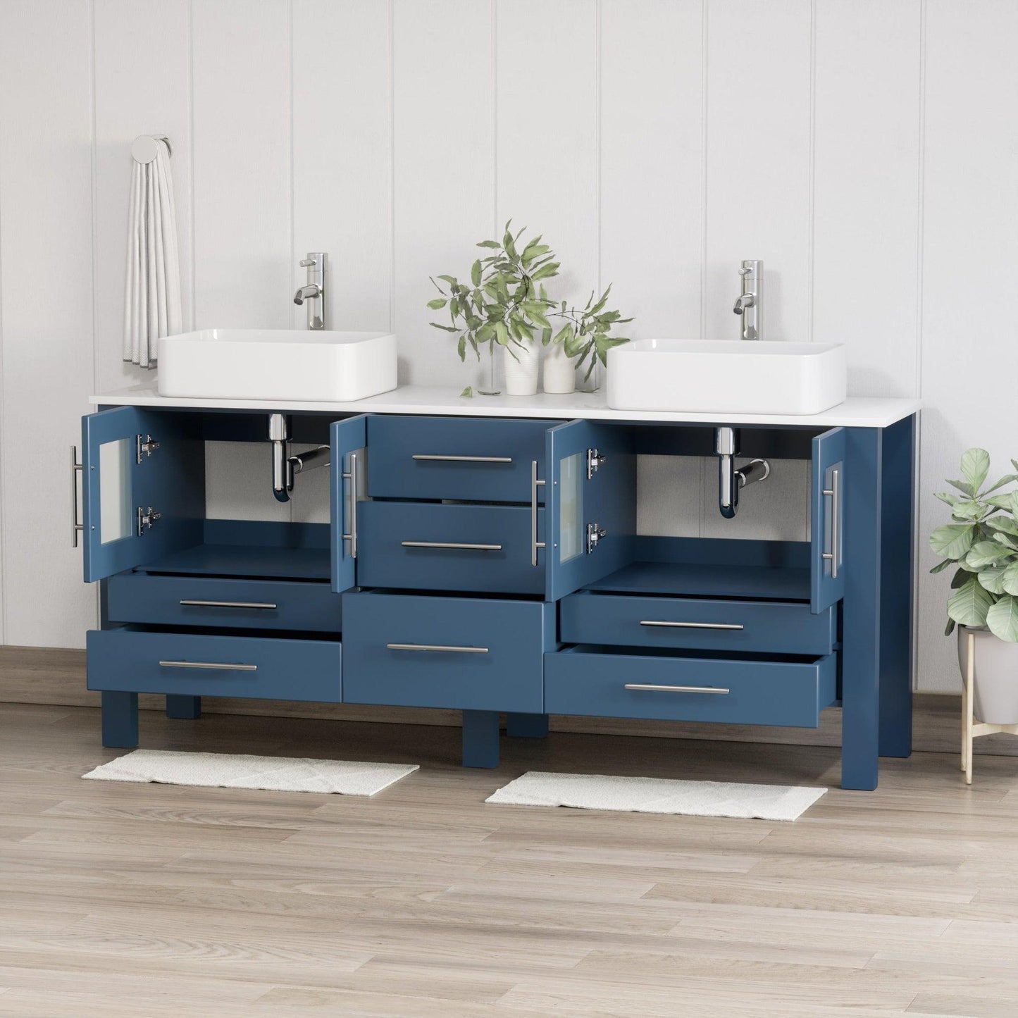 This fantastic double vessel sink vanity is made of solid wood and has a modern blue finish. The white porcelain countertop and vessel sinks add a contemporary flair to this fine bathroom vanity. The cabinet provides ample storage with seven drawers with soft close hinges.