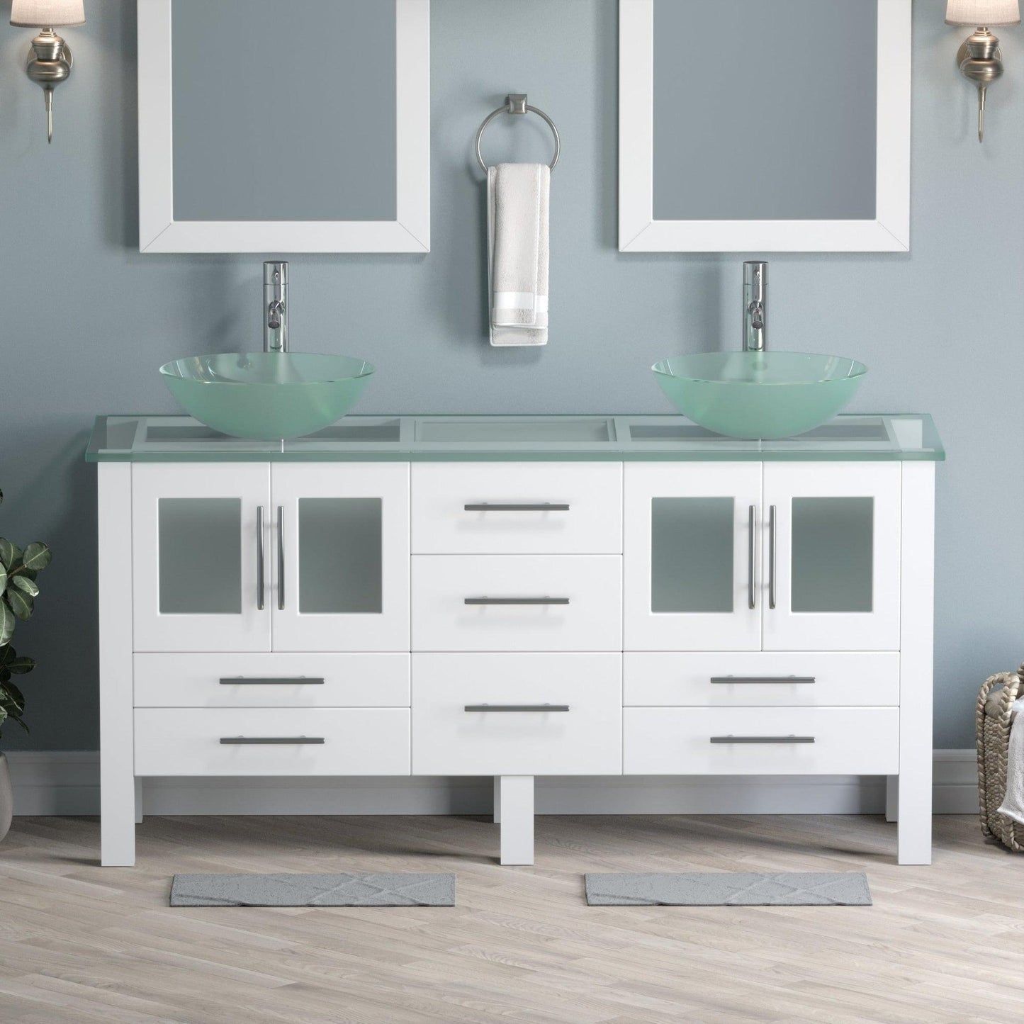 Cambridge Plumbing 63" White Wood Double Vanity Set With Tempered Glass Countertop And Circular Vessel Sink With Polished Chrome Plumbing Finish
