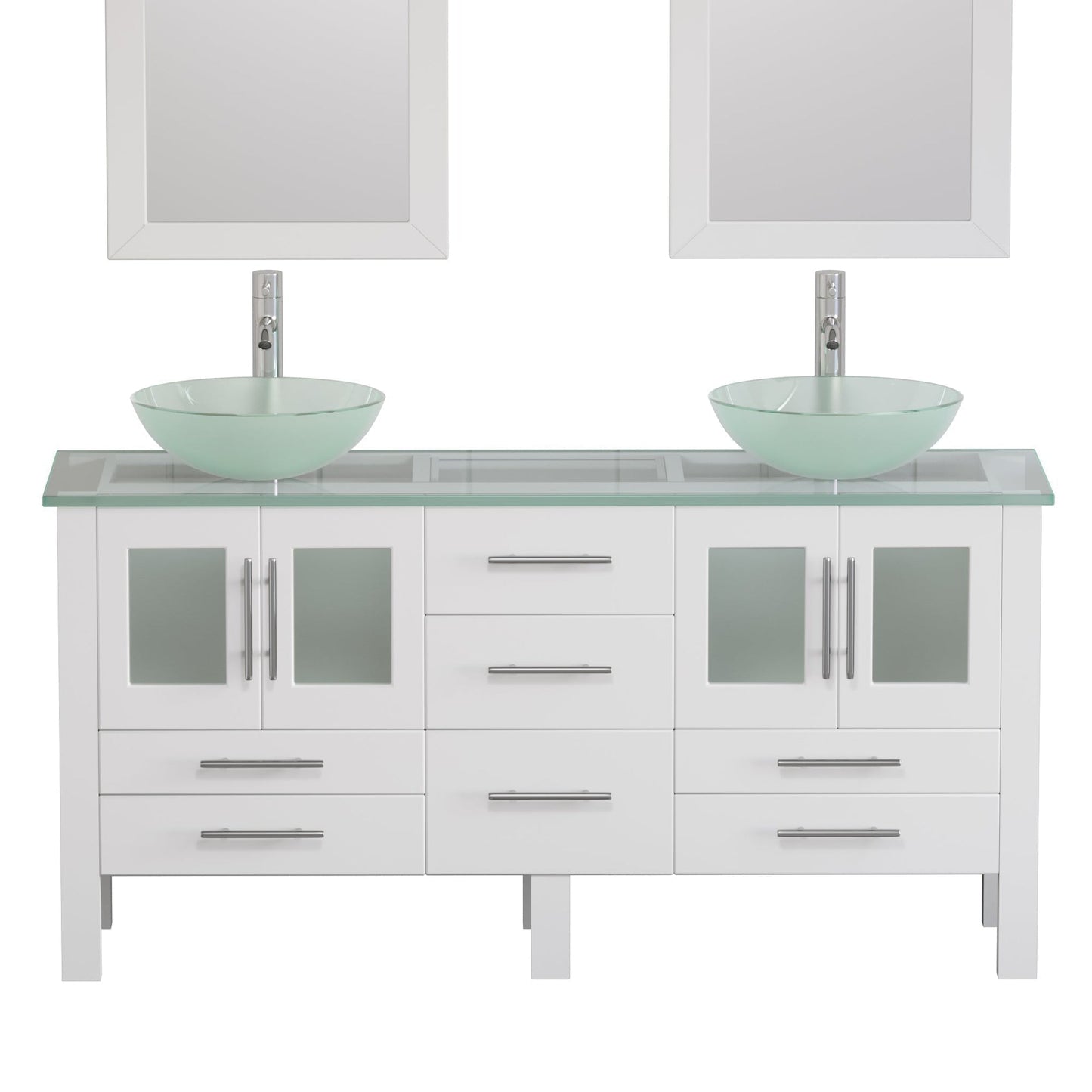 Bring a home part of America with this 63-inch solid wood and glass double vanity set. The cabinet is proudly manufactured in Missouri from mostly domestic components. It has dovetailed drawers in all four corners and slow-close hinges and glides. It has plenty of storage space with 7 drawers and 2 large storage spaces. The set comes complete with a cabinet, imported glass counter, round vessel sink, and polished chrome faucets and pop-up drains. Get yours today!