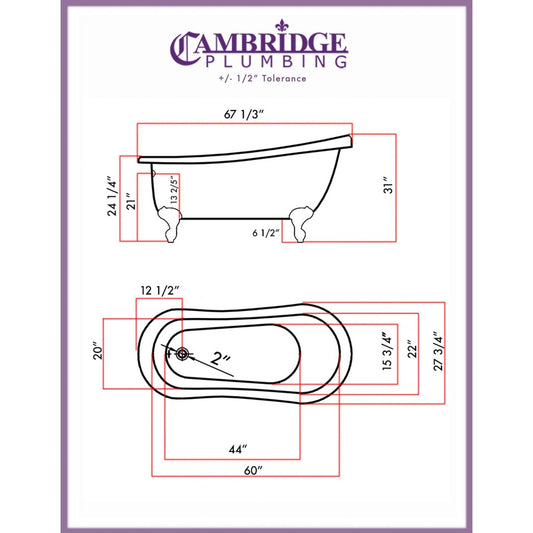Cambridge Plumbing 67" White Acrylic Single Slipper Clawfoot Bathtub With No Faucet Holes With Brushed Nickel Clawfeet