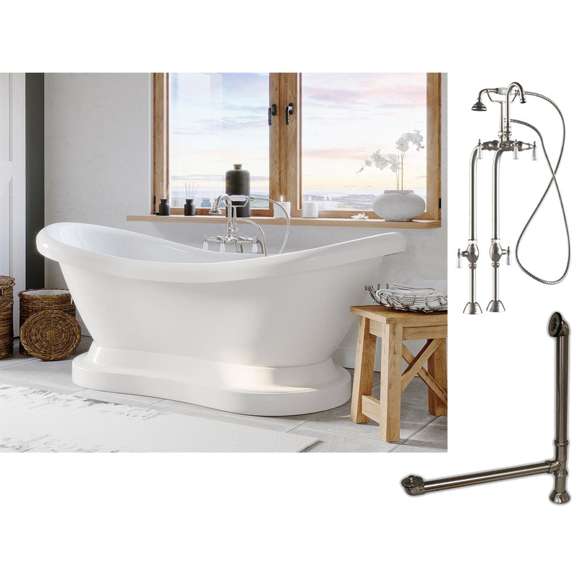 Cambridge Plumbing 69" White Double Slipper Pedestal Acrylic Bathtub With No Deck Holes And Complete Plumbing Package Including Freestanding English Telephone Gooseneck Faucet, Drain And Overflow Assembly In Brushed Nickel