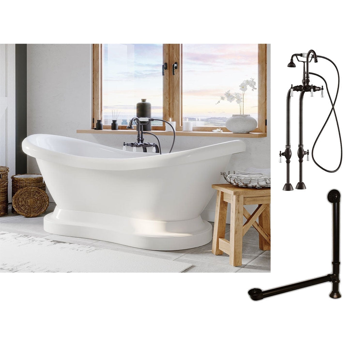 Cambridge Plumbing 69" White Double Slipper Pedestal Acrylic Bathtub With No Deck Holes And Complete Plumbing Package Including Freestanding English Telephone Gooseneck Faucet, Drain And Overflow Assembly In Oil Rubbed Bronze