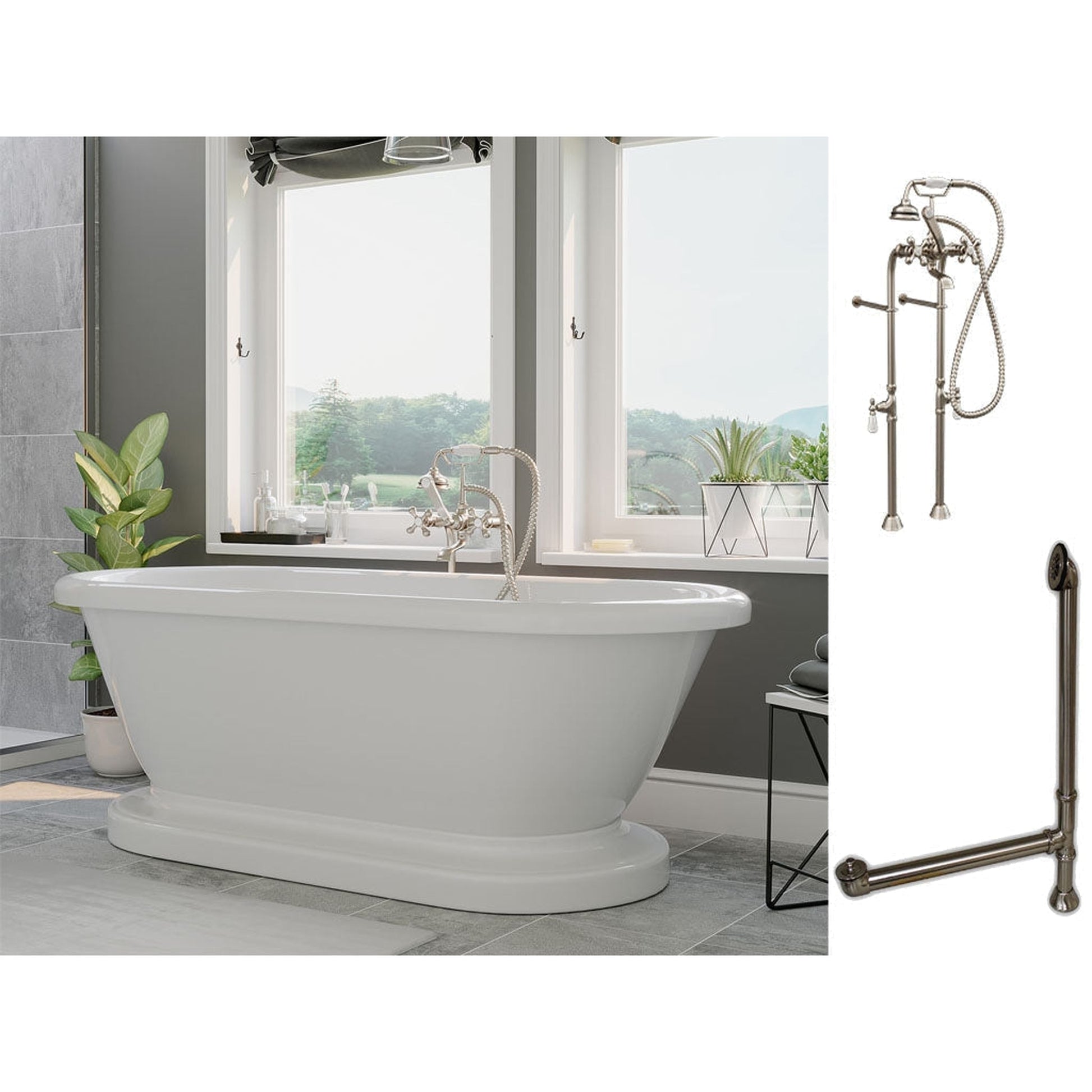Cambridge Plumbing 70" White Acrylic Double Ended Pedestal Bathtub With No Deck Holes And Complete Plumbing Package Including Floor Mounted British Telephone Faucet, Drain And Overflow Assembly In Brushed Nickel