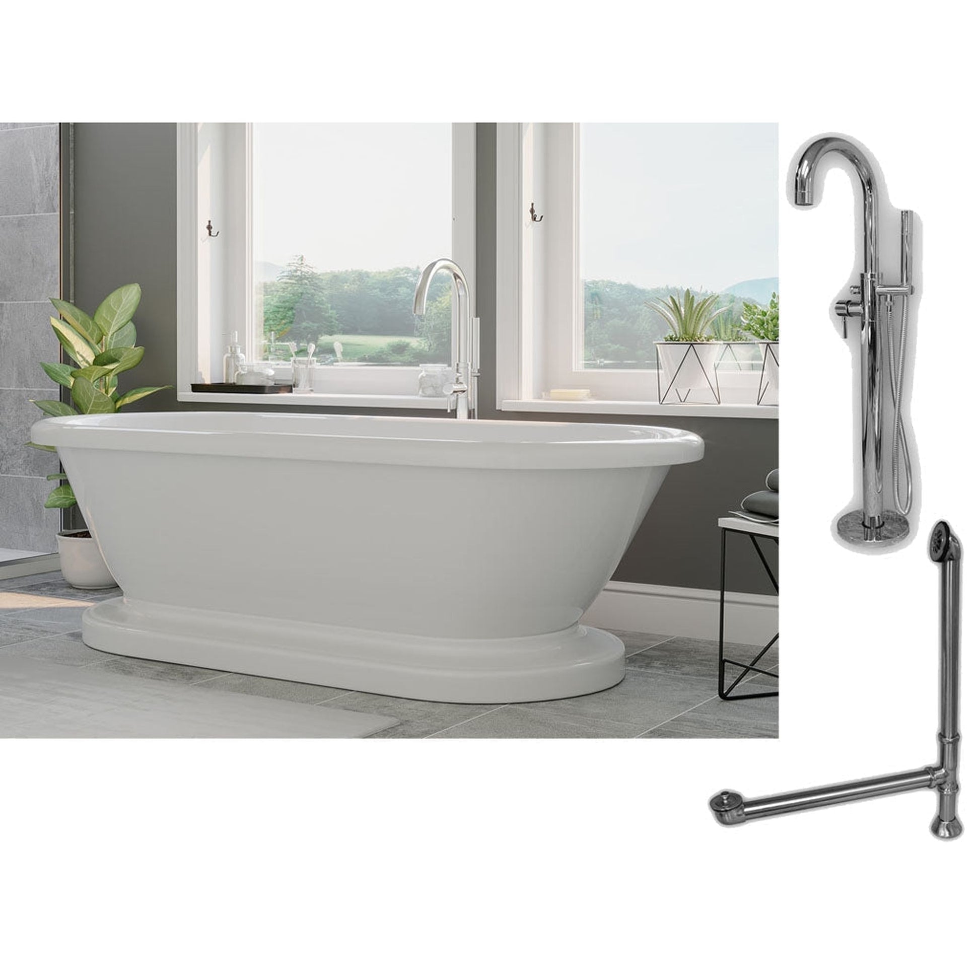 Cambridge Plumbing 70" White Acrylic Double Ended Pedestal Bathtub With No Deck Holes And Complete Plumbing Package Including Modern Floor Mounted Faucet, Drain And Overflow Assembly In Polished Chrome