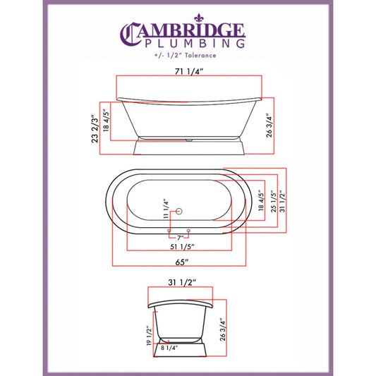 Cambridge Plumbing 71" White Cast Iron Double Ended Pedestal Bathtub With Deck Holes