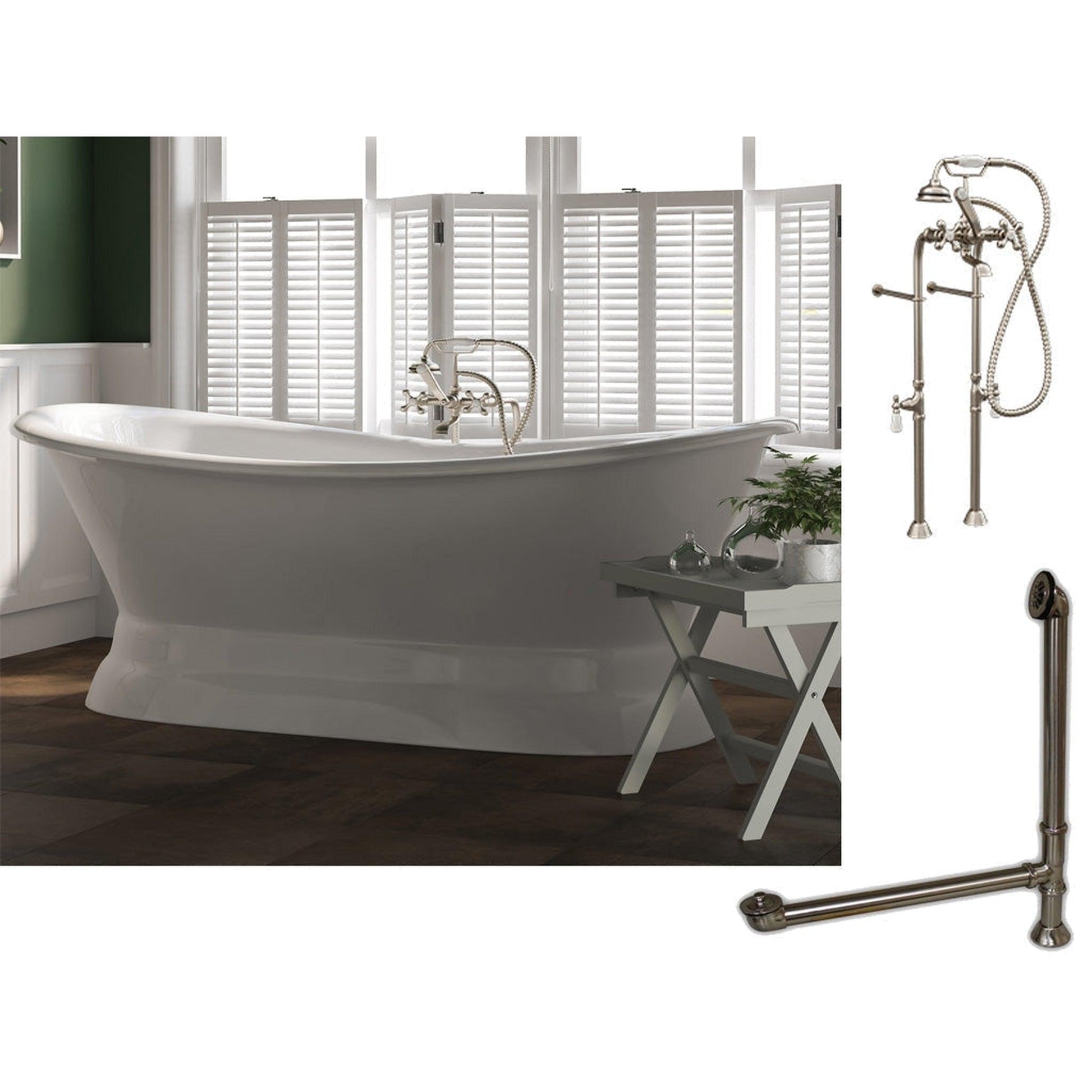 Cambridge Plumbing 71" White Cast Iron Double Slipper Pedestal Bathtub With No Faucet Holes And Complete Plumbing Package Including Floor Mounted British Telephone Faucet, Drain And Overflow Assembly In Brushed Nickel