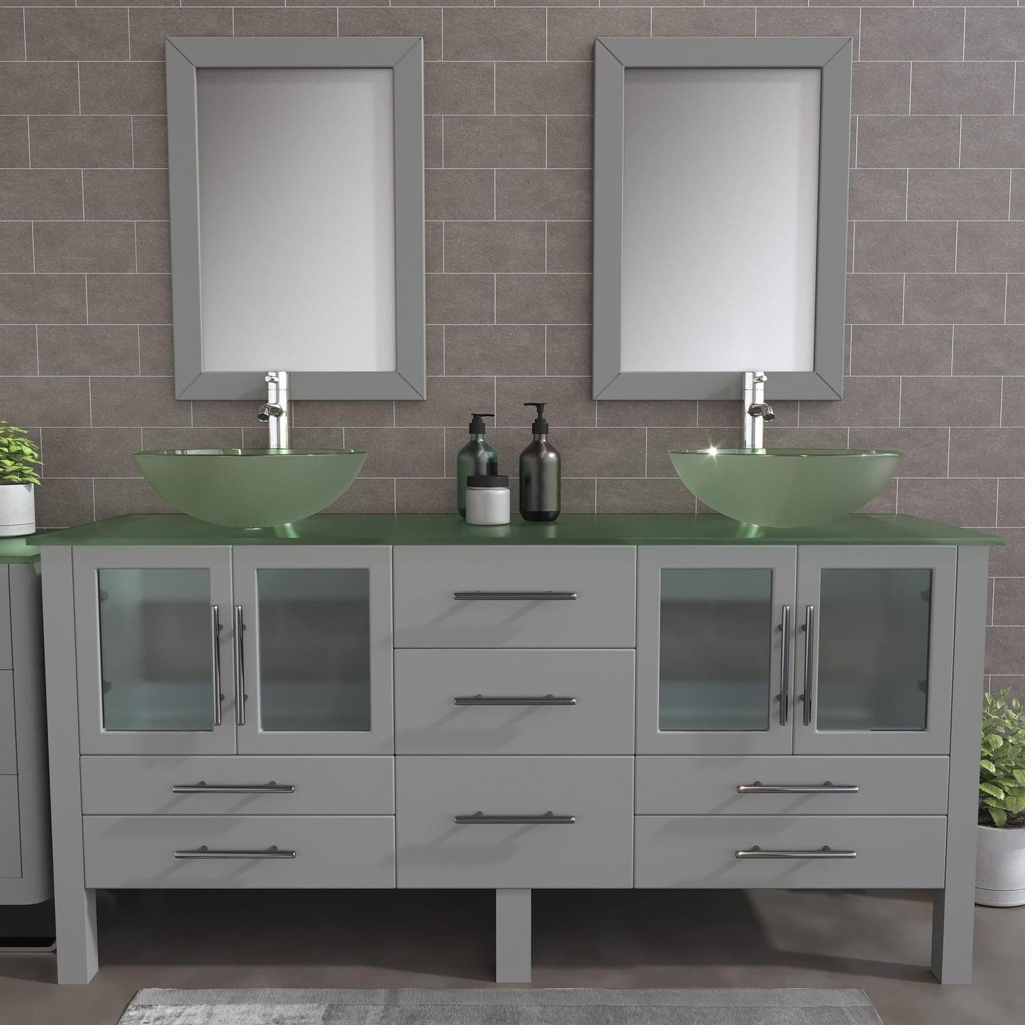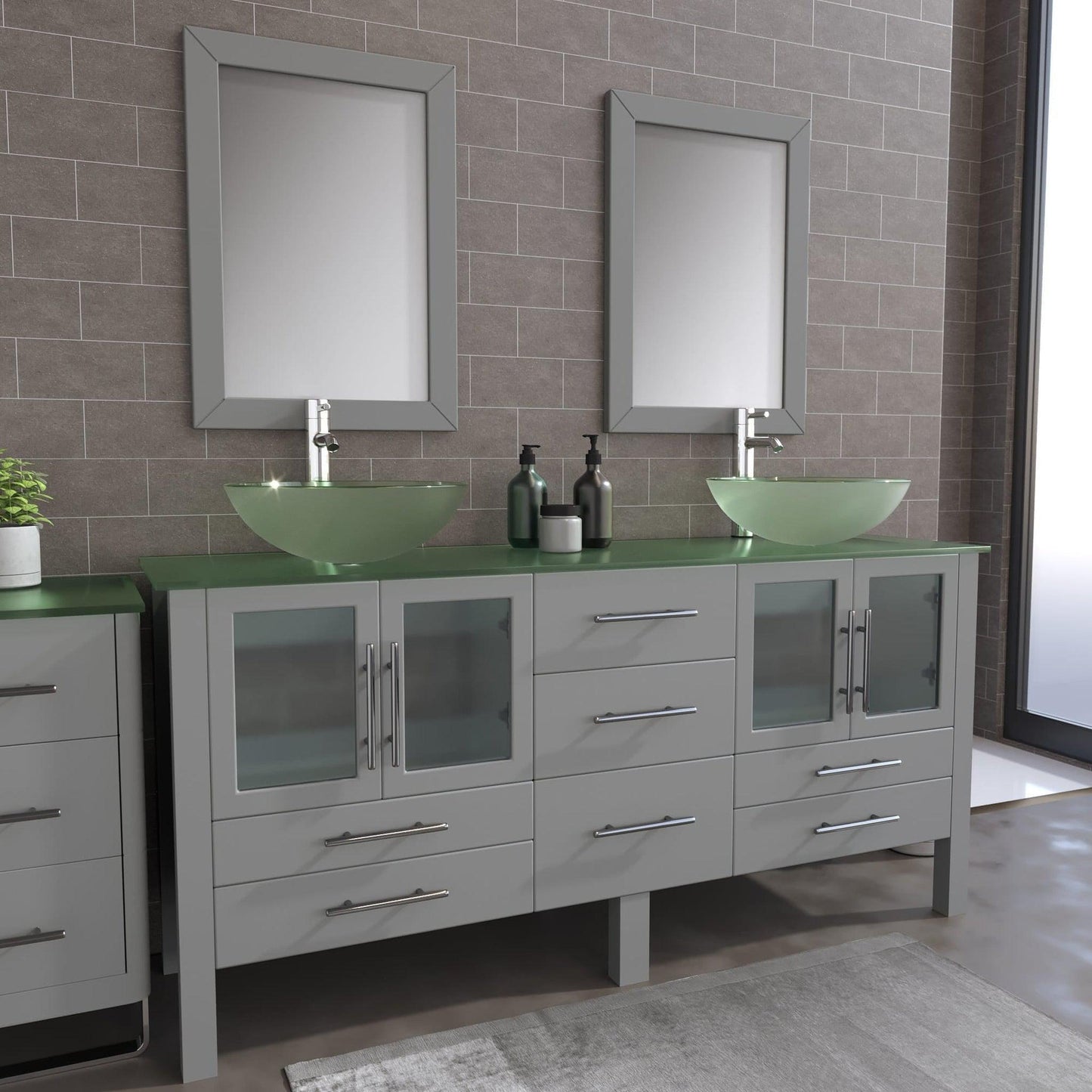 This 71-inch modern bathroom vanity comes complete with soft-closing doors and drawers, which will extend the life of the gray wood cabinet. There are two elegant glass vessel sinks on a tempered glass countertop. Additionally, there are two tall single stem faucets and two matching mirrors.