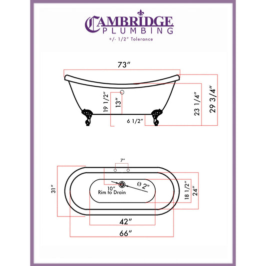 Cambridge Plumbing 73" White Double Slipper Clawfoot Acrylic Bathtub With Deck Holes With Polished Chrome Clawfeet