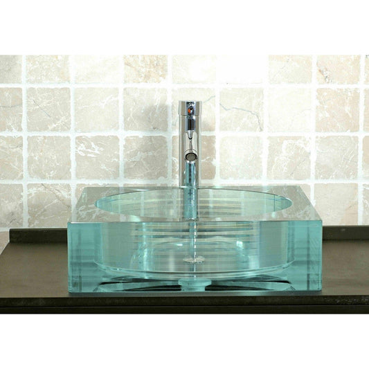 This glass square bathroom sink, by Cantrio is the epitome of contemporary style. This refined statement piece is equipped with 1 pre-drilled hole, ideal for a vessel-mounted faucet of your choosing, and a pre-drilled center drain. The stain-resistant clear surface and unparalleled design make this above-mounted sink both practical and sophisticated.