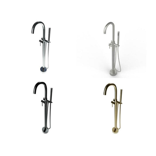 Enhance and complete your new freestanding or clawfoot tub with the beautiful Neptune Floor-Mounted Tub Filler. Constructed from durable solid brass, this tub filler is designed to resist corrosion and stay in prime shape for years to come. The smooth color and defined lines can give a wonderful compliment or a striking contrast to your existing tub. The included handheld shower adds significant functionality, allowing you to rinse off yourself, a loved one, a pet, or even the tub itself with ease. The built-in diverter easily switches between the faucet and the handheld shower. A stunning addition to any freestanding bathtub or bathroom space.