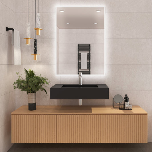 Embrace modern design and feel with this minimalist wall-mounted sink. Simple yet sophisticated, this modern sink is designed to look as if it is floating in your bathroom. Its standard rectangular design works well in many bathroom decor configurations and setups. The angular design of the sink basin leads the eye to the back of the sink wall, making it unique compared to other standard sinks. Made with high-quality and durable solid surface material, this sink features a clean and consistent color throughout as well as durable construction to ensure lasting quality and appearance. The surface can be easily cleaned with most non-abrasive cleaning agents. A great accent for any washroom, bathroom, or power room. Natural Stone Color Variation (Natural differences in color and finish)