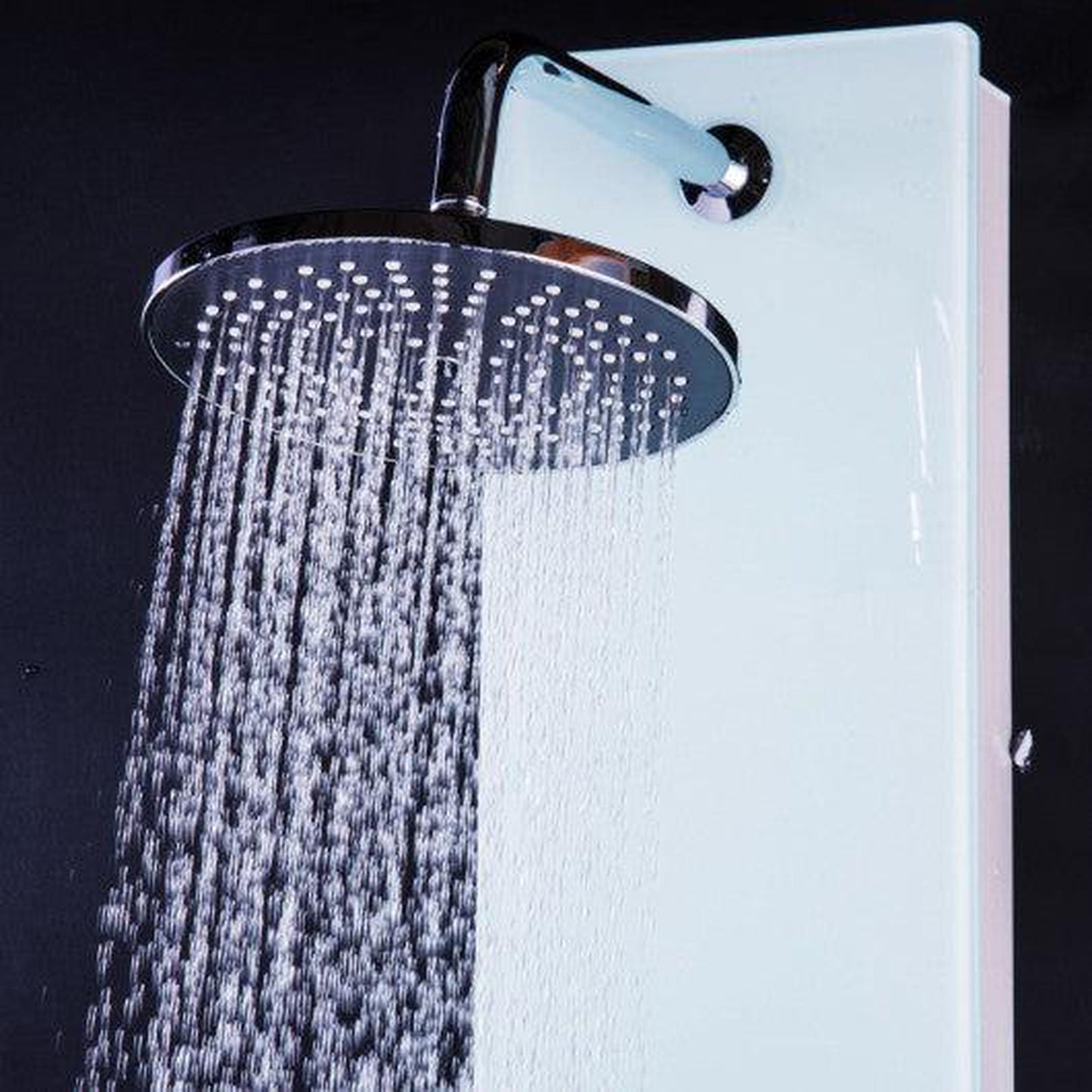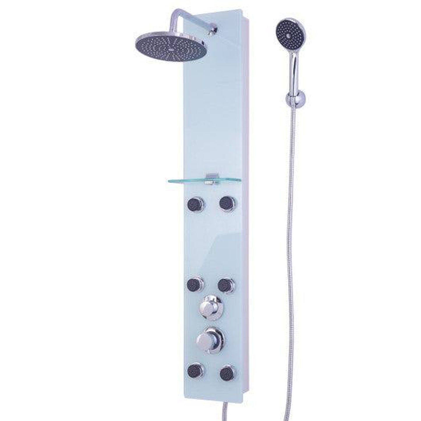 This is shower panel set of good quality with tempered glass construction. It is equipped with the head and hand shower function diverter water mixer hose six body massage jets. And a convenient glass shelf providing a place to put shampoo or other bathing products is also included. Solid tempered glass steel material and considerate design make it a durable and delightful appearance. It is very popular with people from all walks of life and it is perfect for your home or apartment. Don’t hesitate to buy it now!