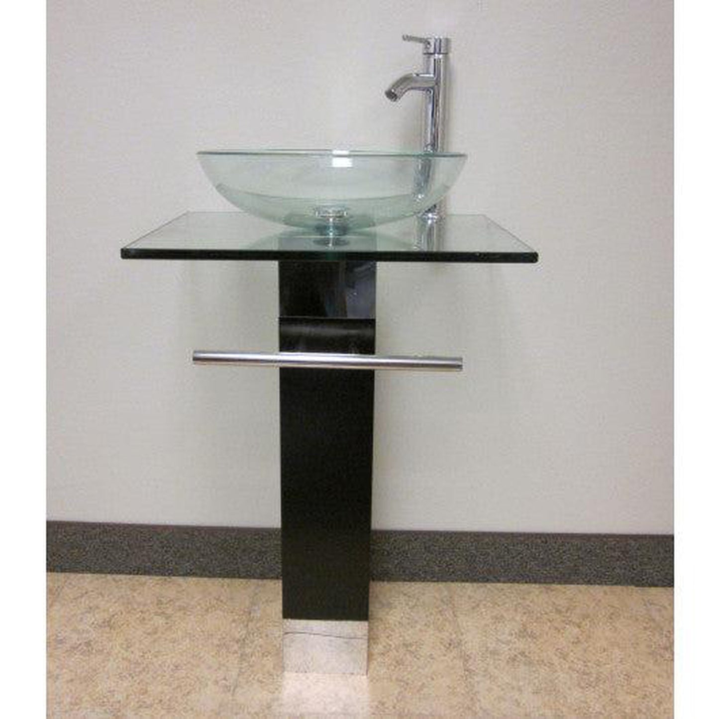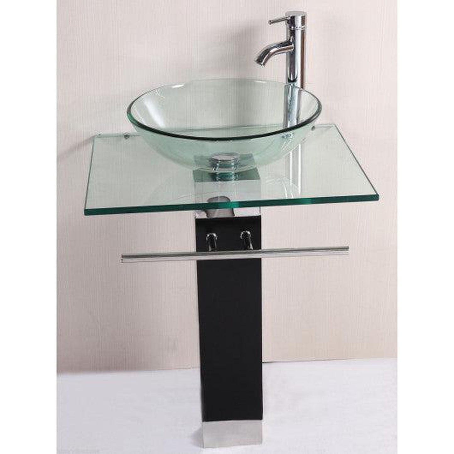 This glass pedestal glass sink vanity with a wooden base adds a clean appearance to any bathroom while ensuring a feeling of comfort and ease. It comes with a glass sink a mesa a stainless pedestal with a modern faucet a water drainage system a towel bar and a wooden vanity base. With excellent craftsmanship the set is easy to assemble and ensures a long service life. The pedestal has an open back to hide the plumbing. The vanity set with a simple design can be a best complement to any bathroom decor.
