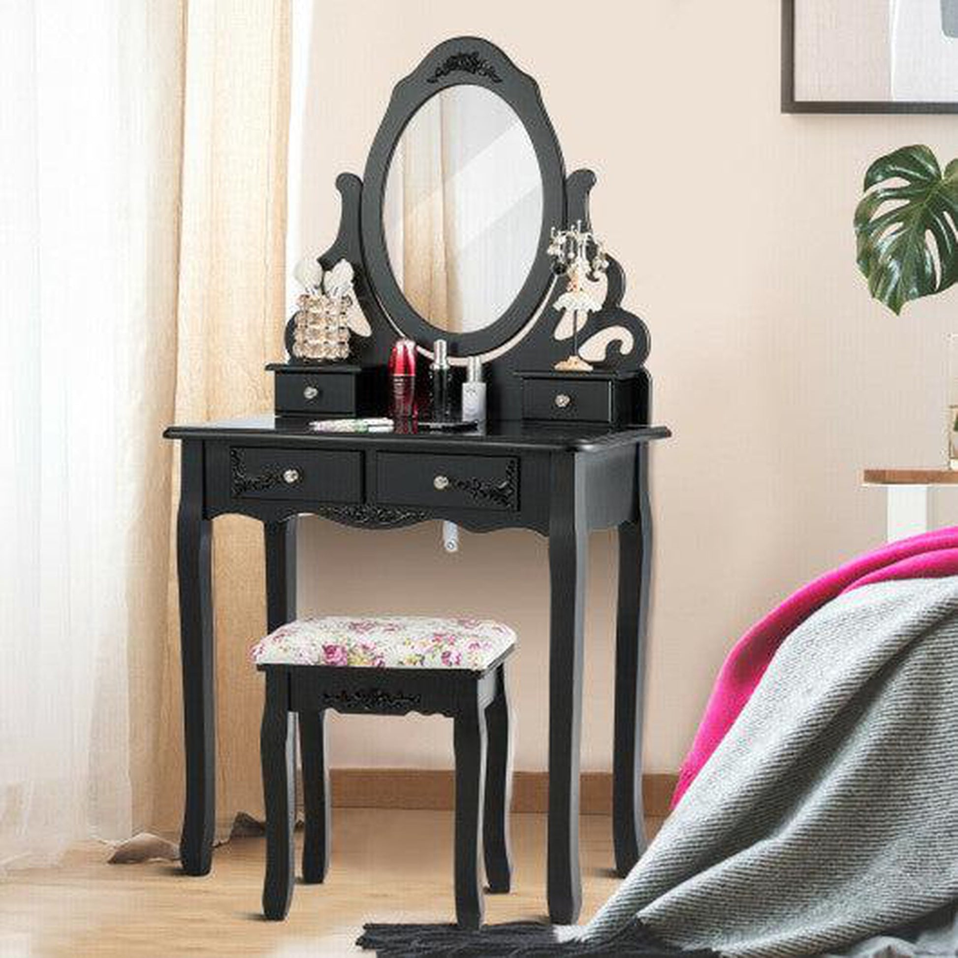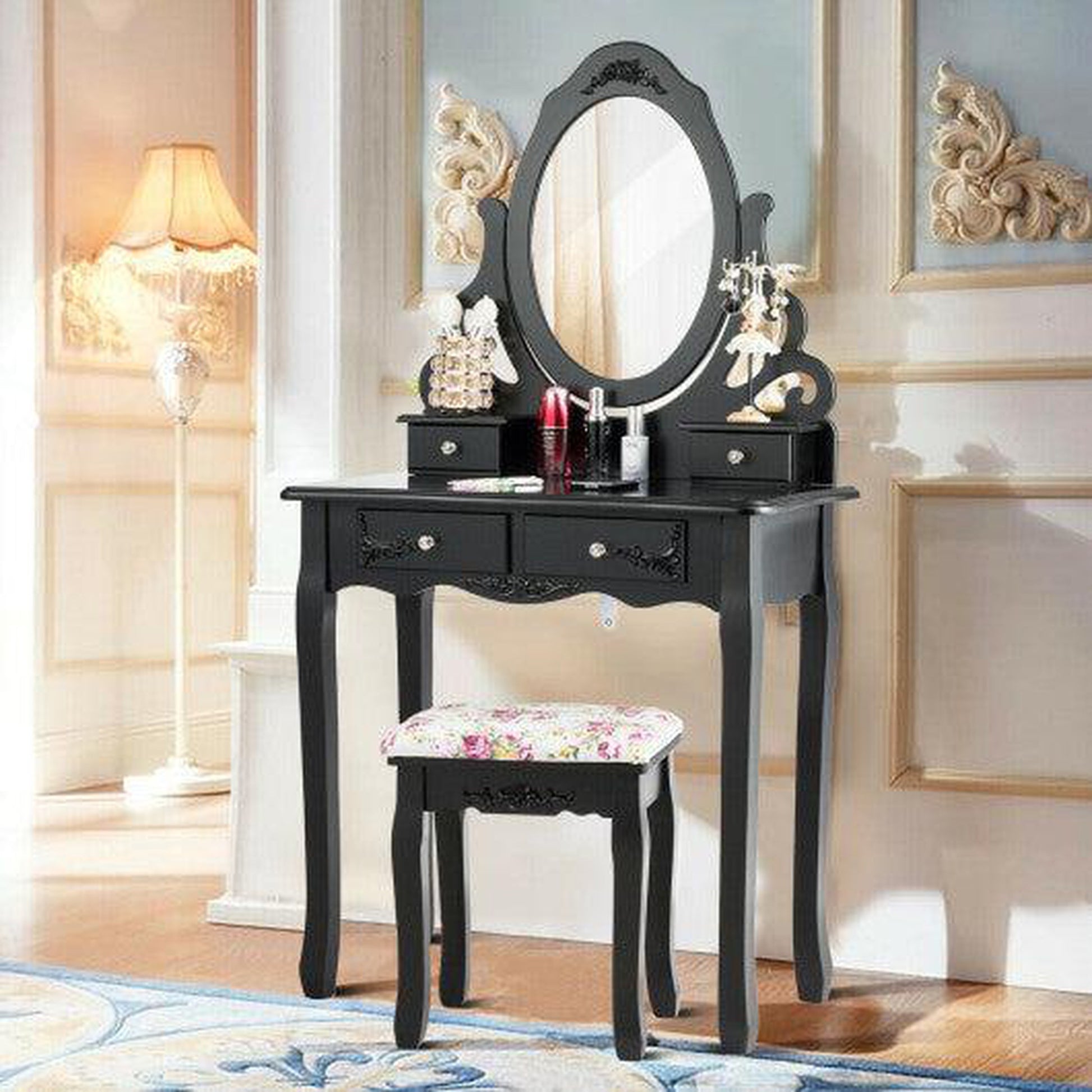 Costway Black 4 Drawers Vanity Wood Makeup Dressing Table Set with Mirror
