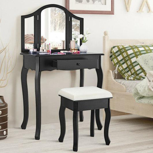 Costway Black Vanity Makeup Dressing Table Set with Tri-Folding Mirror and Drawer