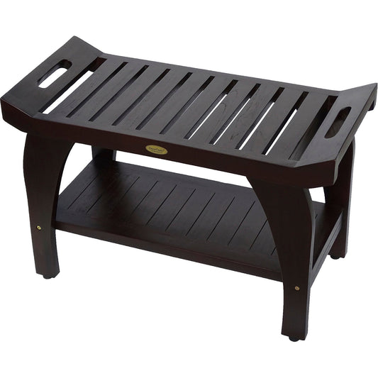 DecoTeak Tranquility 30" W x 18" H Woodland Brown Solid Teak Wood Shower Bench With Shelf and LiftAide Arms