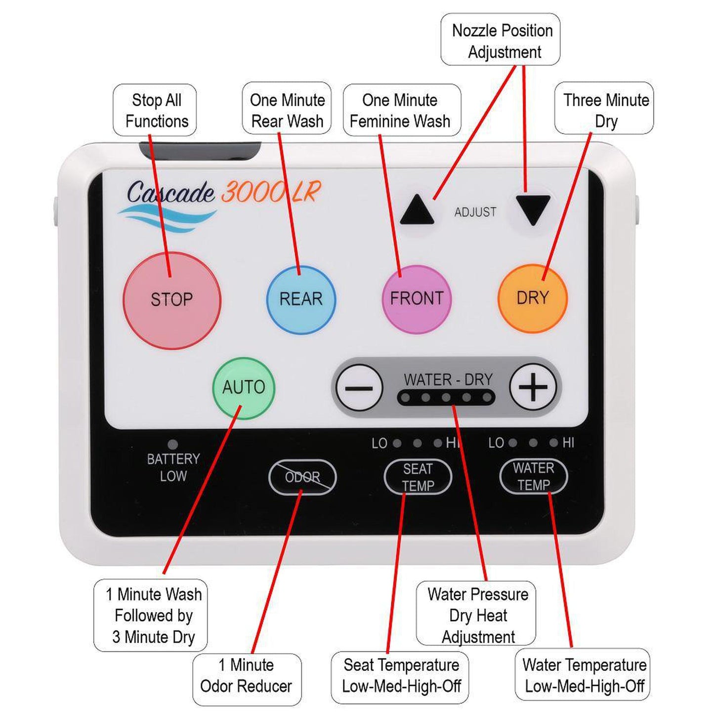 Operating the Cascade 3000 is easy thanks to its user-friendly wireless remote. The large remote measures 6.75" x 4.78", and both its size and layout make it a good option for anyone with vision or dexterity difficulties. This is the only bidet control on the market designed with Age In Place, Living with Disabilities, and care facilities in mind. The large colored buttons are designed to be easy to understand and operate. |